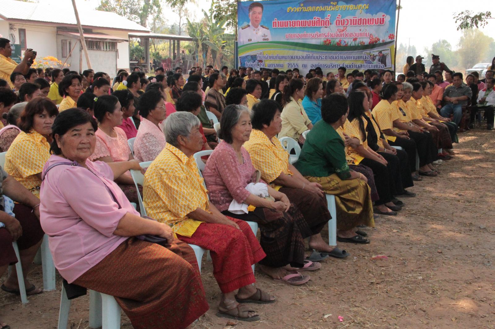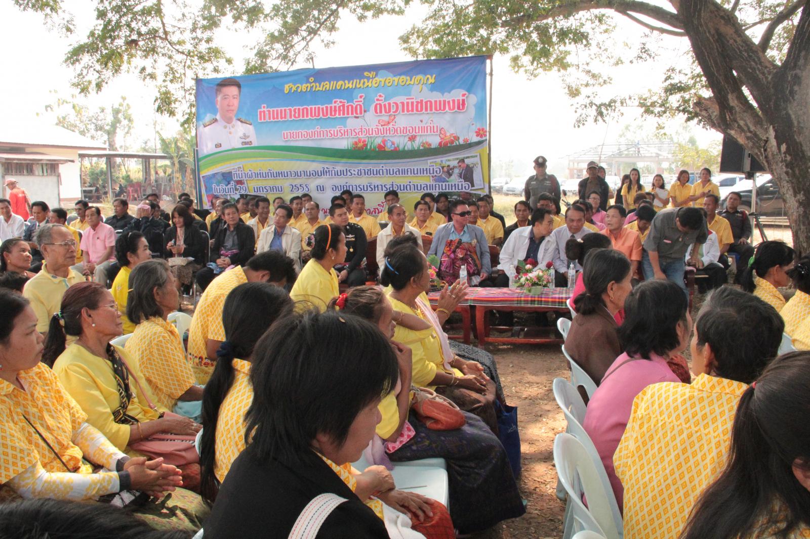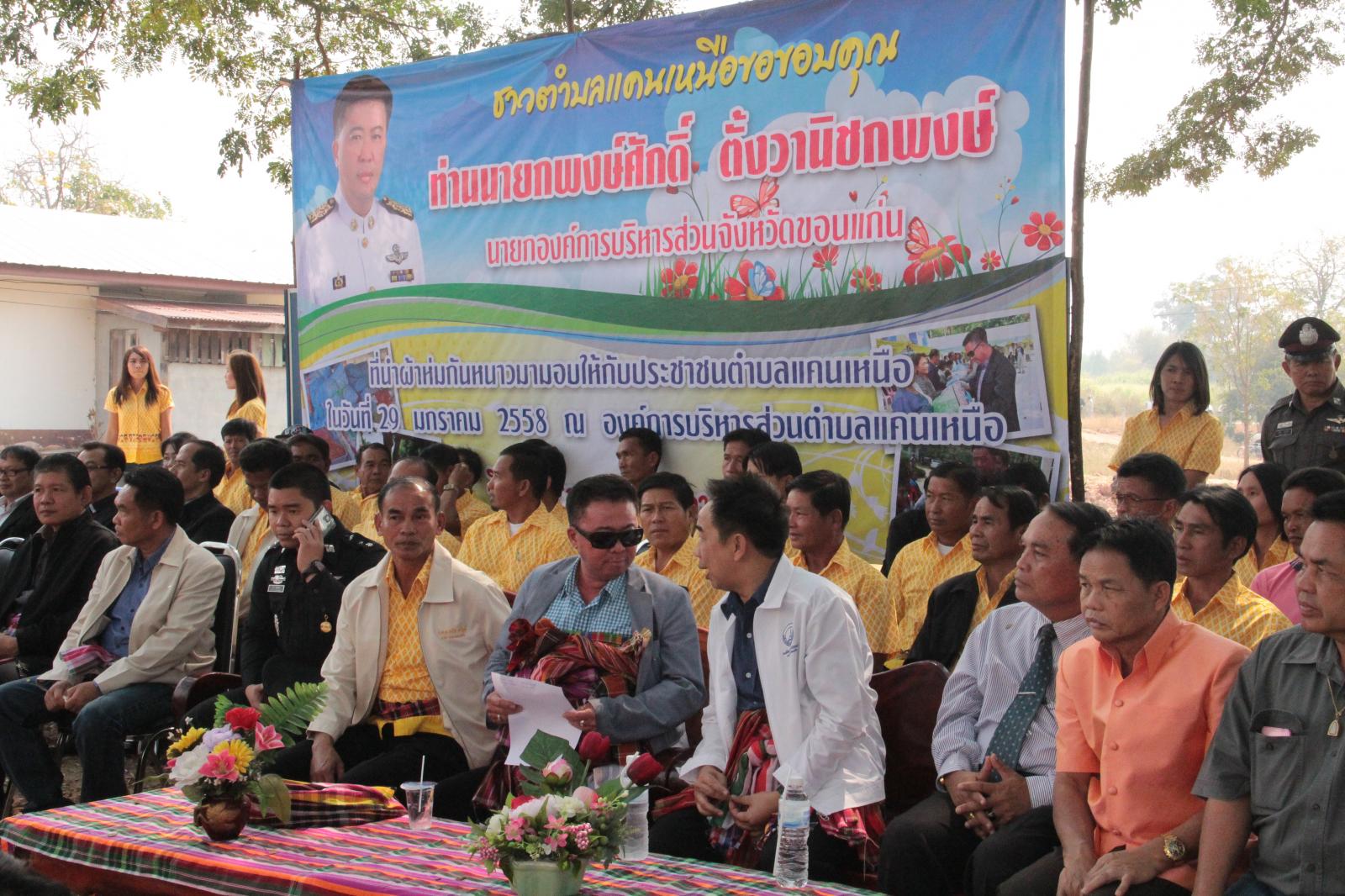 วันที่ 29 มกราคม 2558 ดร.พงษ์ศักดิ์ ตั้งวานิชกพงษ์ นายกองค์การบริหารส่วนจังหวัดขอนแก่น นายองอาจ ฉัตรชัยพลรัตน์ ส.อบจ.ขอนแก่น อ.สีชมพู เขต 1 นายจิรยุทธ โชติศิลากุล ส.อบจ.ขอนแก่น อ.เปือยน้อย ได้มอบผ้าห่มกันหนาวจำนวน 300 ผืน ให้กับราษฎรชาวตำบลแคนเหนือ อำเภอบ้านไผ่ ที่กำลังประสบภัยหนาวอยู่ในขณะนี้เพื่อเป็นการบรรเทาความเดือดร้อนเบื้องต้น โดยมี คณะผู้บริหาร สมาชิกสภาตำบล ที่ปรึกษา เลขานุการ ประธานสภา กำนัน ผู้ใหญ่บ้าน ผู้นำชุมชน และประชาชน จำนวนมากให้การต้อนรับ ณ องค์การบริหารส่วนตำบลแคนเหนือ อำเภอบ้านไผ่ จังหวัดขอนแก่น
