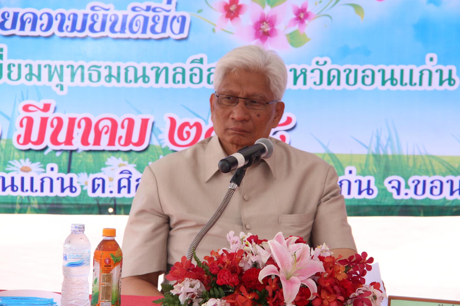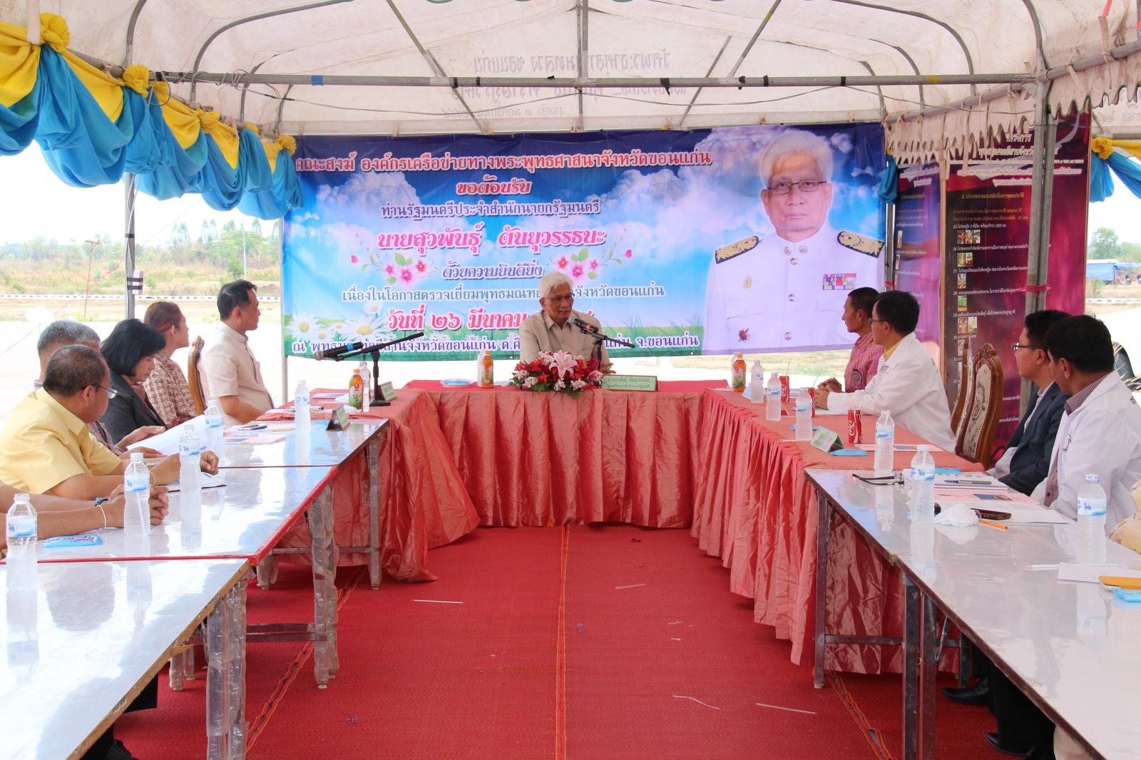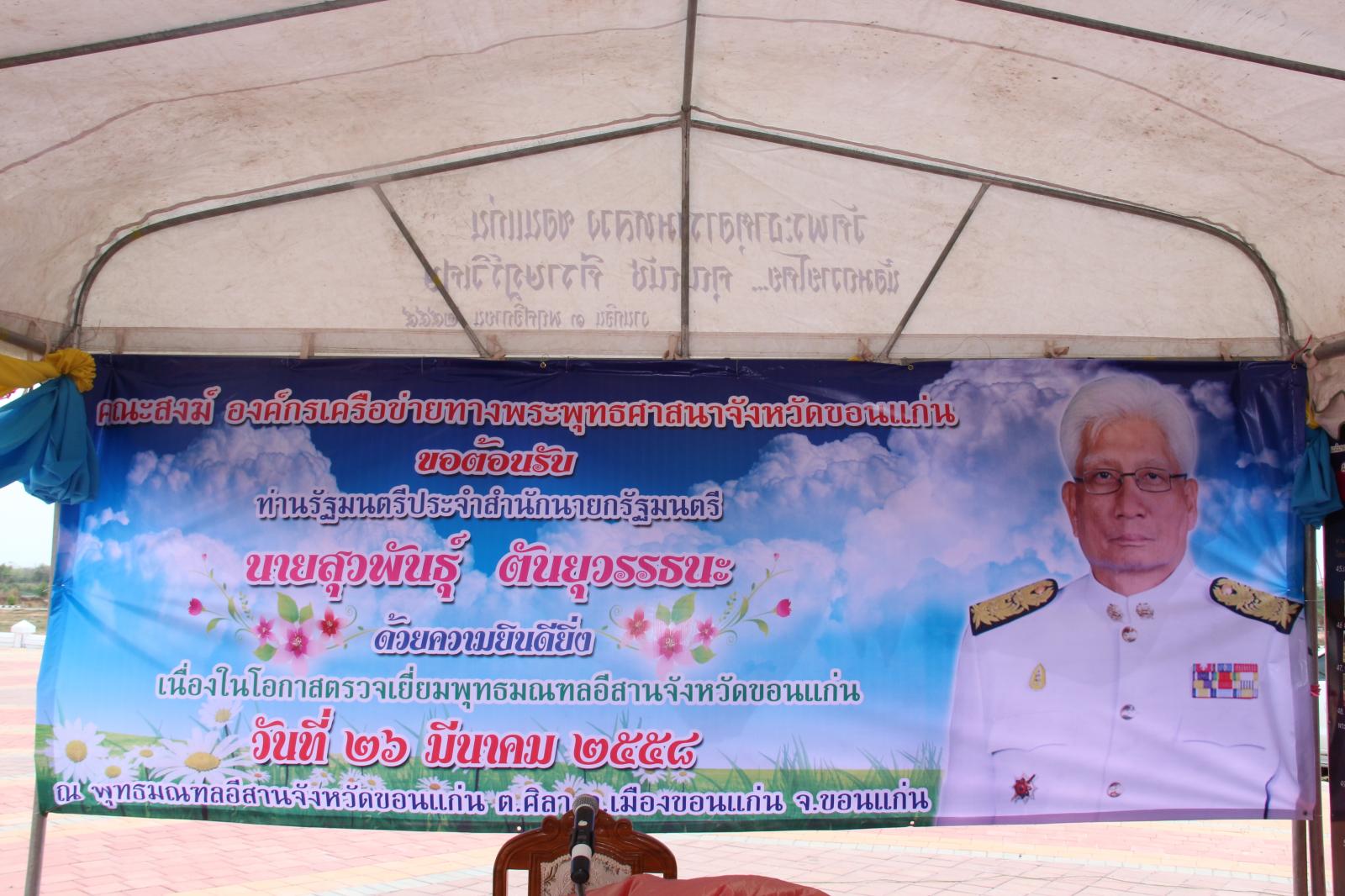 เมื่อวันที่ ๒๖ มีนาคม ๒๕๕๘ นายก อบจ.ขอนแก่น ดร.พงษ์ศักดิ์ ตั้งวานิชกพงษ์ มอบหมายให้ รองปลัด อบจ.ขอนแก่น นายธาดา พรหมสาขา ณ สกลนคร พร้อมด้วย ผู้อำนวยการสำนักการศึกษา ศาสนา และวัฒนธรรม นายปิยะชัย ตุ่ยสิมา ผู้อำนวยการกองช่าง นายวิรัติ นาคนชม หัวหน้าส่วนราชการ และข้าราชการ อบจ.ขอนแก่น ร่วมต้อนรับ รัฐมนตรีประจำสำนักนายกรัฐมนตรี นายสุวพันธุ์ ตันยุวรรธนะ โดยมีผู้อำนวยการสำนักงานพระพุทธศาสนาแห่งชาติ นายพนม ศรศิลป์ ผู้อำนวยการสำนักงานพระพุทธศาสนาจังหวัดขอนแก่น นายบัญชายุทธ นาคมุจลินท์ และปลัดเทศบาลเมืองศิลา ว่าที่ ร.อ.พงเจตน์ พรกุณา ร่วมต้อนรับและบรรยายสรุปการดำเนินงานโครงการก่อสร้างพุทธมณฑลอีสาน จังหวัดขอนแก่น และนำเสนอแผนพัฒนาพุทธมณฑลอีสานจังหวัดขอนแก่น ณ พุทธมณฑลอีสานจังหวัดขอนแก่น ต.ศิลา อ.เมืองขอนแก่น จ.ขอนแก่น