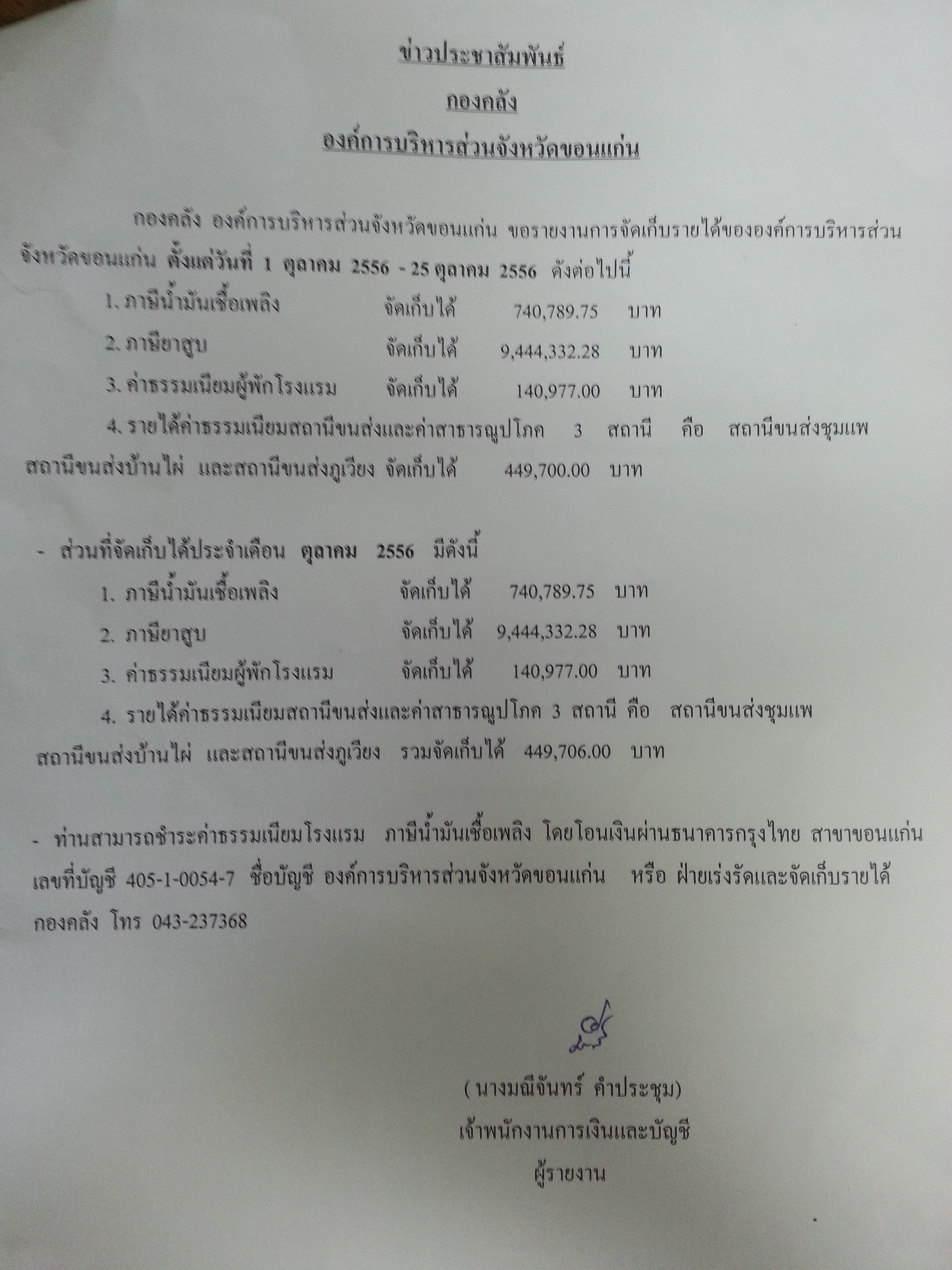 การจัดเก็บรายได้ขององค์การบริหารส่วนจังหวัดขอนแก่น ประจำเดือน ตุลาคม 2556