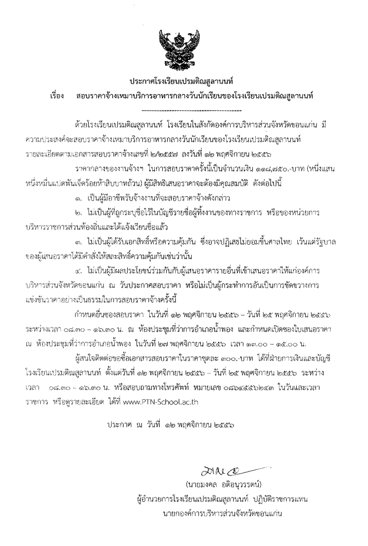 สอบราคาจ้างเหมาบริการอาหารกลางวันนักเรียนของโรงเรียนเปรมติณสูลานนท์