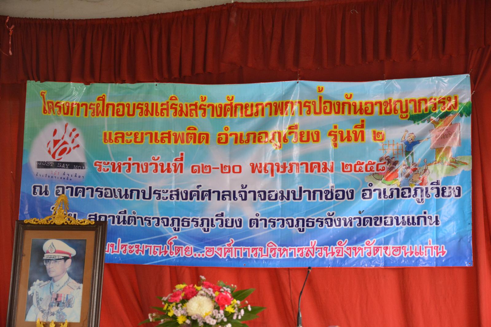 ดร.พงษ์ศักดิ์ ตั้งวานิชกพงษ์ นายกองค์การบริหารส่วนจังหวัดขอนแก่น เป็นประธานเปิดโครงการฝึกอบรมเสริมสร้างศักยภาพการป้องกันอาชญากรรม และยาเสพติด อำเภอภูเวียง รุ่นที่ 1 ซึ่งจัดอบรมในระหว่างวันที่ 12 -20 พฤษภาคม 2558 ณ ลานอเนกประสงค์ศาลเจ้าจอมปากช่อง อ.ภูเวียง โดยมีนายภาควัต ศรีสุรพล ส.อบจ.ขอนแก่น เขต อ.ภูเวียง นายวิบูลย์ เรืองประเสริฐกุล ส.อบจ.ขอนแก่น เขต อ.เวียงเก่า เข้าร่วมในพิธีเปิดดังกล่าว