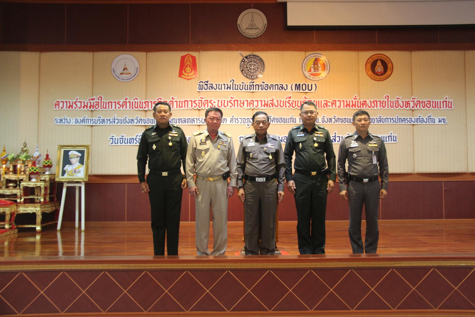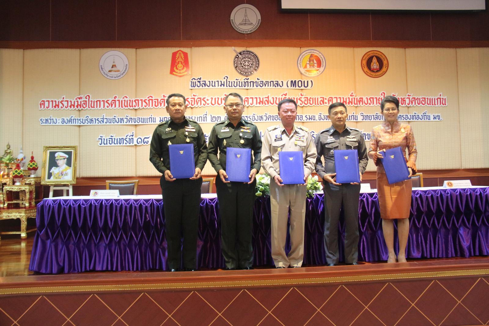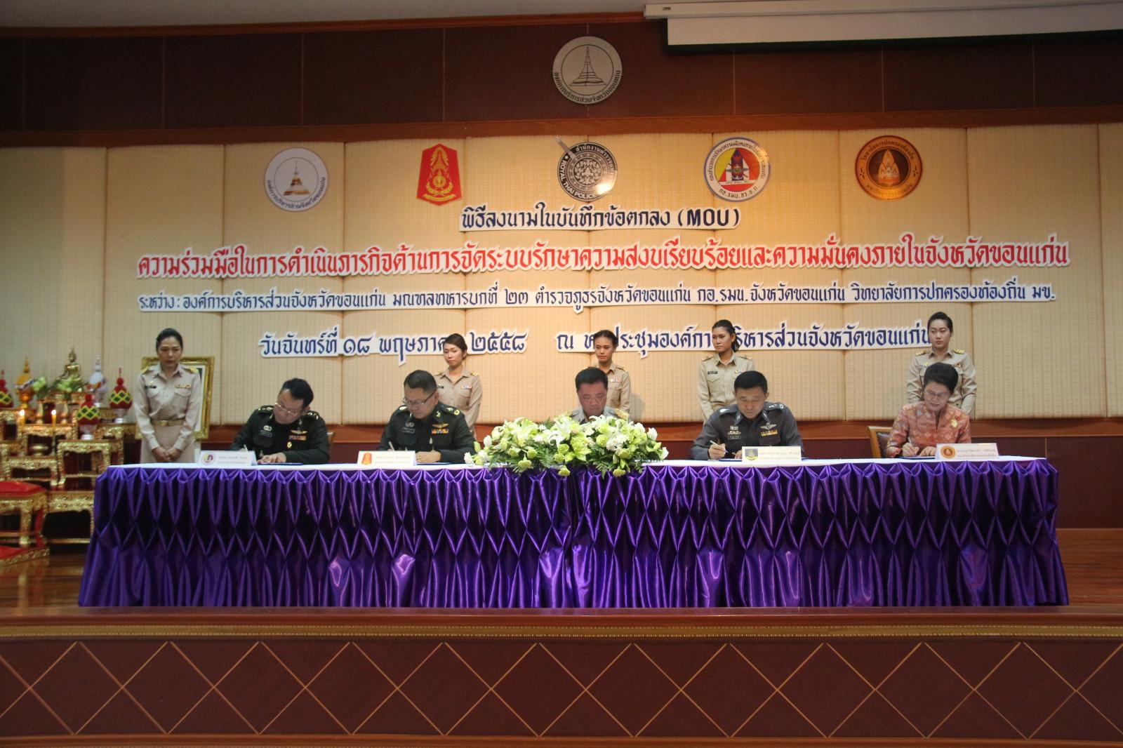 ในโอกาสนี้ องค์การบริหารส่วนจังหวัดขอนแก่น โดย นายก อบจ.ขอนแก่น ดร.พงษ์ศักดิ์ ตั้งวานิชกพงษ์ จัดให้มีพิธีลงนามบันทึกข้อตกลงความร่วมมือในการดำเนินภารกิจด้านการจัดระบบรักษาความสงบเรียบร้อย และความมั่นคงภายในจังหวัดขอนแก่น โดยมี ผู้บัญชาการมณฑลทหารบกที่ ๒๓ พลตรี ธรากฤต ทับทองสิทธ์, ผู้บังคับการตำรวจภูธร จังหวัดขอนแก่น พล.ต.ต.จิตรจรูญ ศรีวนิชย์ ,รองผู้อำนวยการรักษาความมั่นคงภายใน จังหวัดขอนแก่น พันเอก จตุรพงศ์ บกบน และคณบดีวิทยาลัยปกครองท้องถิ่น รศ.ดร.ศุภวัฒนากร วงศ์ธนวสุ เป็นผู้ร่วมลงนาม ทั้งนี้มีสมาชิกสภาองค์การบริหารส่วนจังหวัดขอนแก่น พร้อมด้วย คณะผู้บริหาร หัวหน้าส่วนราชการ ข้าราชการ ข้าราชการครูโรงเรียนในสังกัดองค์การบริหารส่วนจังหวัดขอนแก่น ตลอดจนสื่อมวลชนทุกแขนงในจังหวัดขอนแก่น ร่วมเป็นเกียรติในพิธี ณ หอประชุมองค์การบริหารส่วนจังหวัดขอนแก่น องค์การบริหารส่วนจังหวัดขอนแก่น อ.เมืองขอนแก่น จ.ขอนแก่น