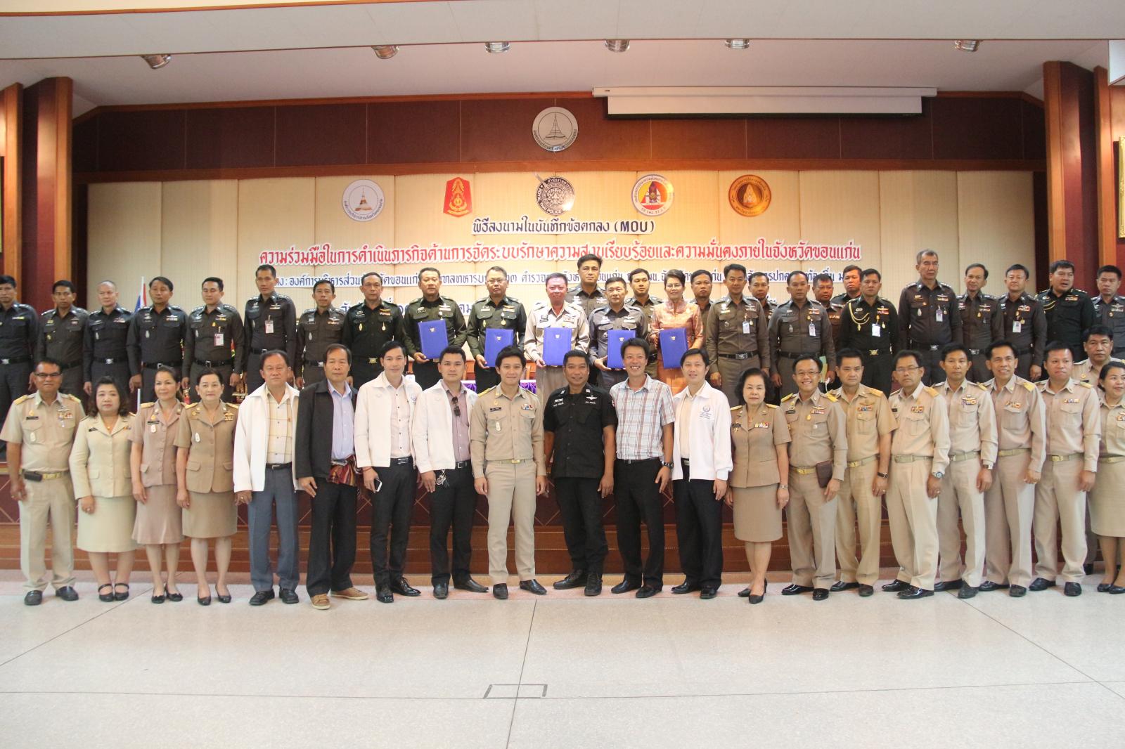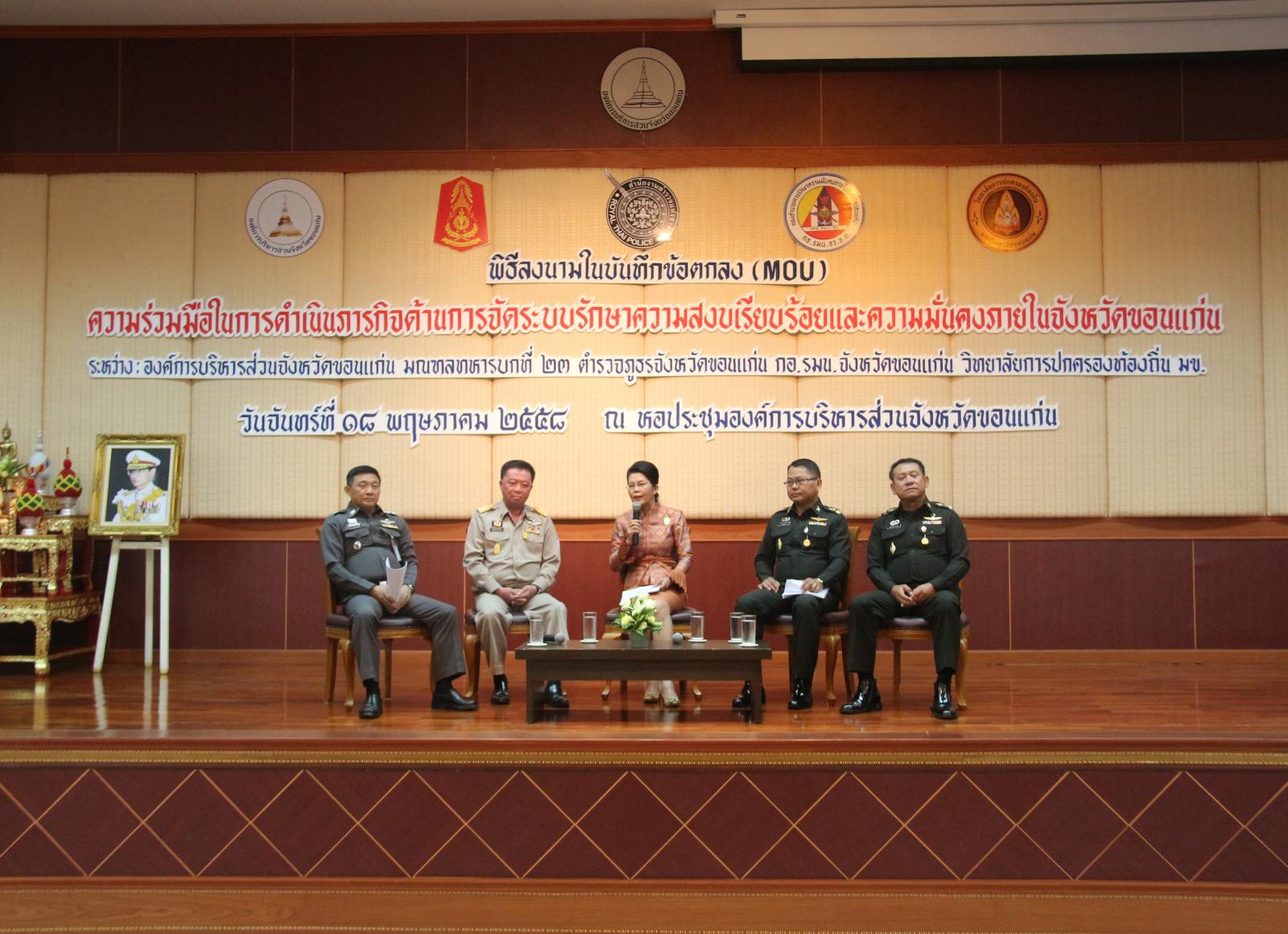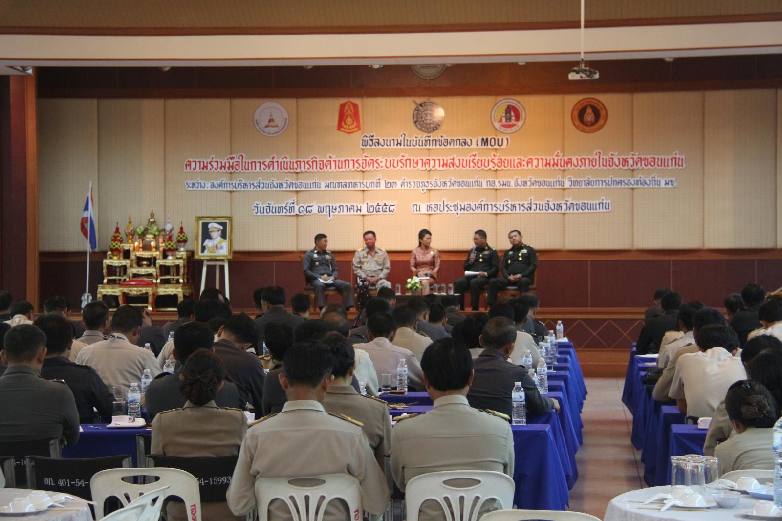 ในโอกาสนี้ องค์การบริหารส่วนจังหวัดขอนแก่น โดย นายก อบจ.ขอนแก่น ดร.พงษ์ศักดิ์ ตั้งวานิชกพงษ์ จัดให้มีพิธีลงนามบันทึกข้อตกลงความร่วมมือในการดำเนินภารกิจด้านการจัดระบบรักษาความสงบเรียบร้อย และความมั่นคงภายในจังหวัดขอนแก่น โดยมี ผู้บัญชาการมณฑลทหารบกที่ ๒๓ พลตรี ธรากฤต ทับทองสิทธ์, ผู้บังคับการตำรวจภูธร จังหวัดขอนแก่น พล.ต.ต.จิตรจรูญ ศรีวนิชย์ ,รองผู้อำนวยการรักษาความมั่นคงภายใน จังหวัดขอนแก่น พันเอก จตุรพงศ์ บกบน และคณบดีวิทยาลัยปกครองท้องถิ่น รศ.ดร.ศุภวัฒนากร วงศ์ธนวสุ เป็นผู้ร่วมลงนาม ทั้งนี้มีสมาชิกสภาองค์การบริหารส่วนจังหวัดขอนแก่น พร้อมด้วย คณะผู้บริหาร หัวหน้าส่วนราชการ ข้าราชการ ข้าราชการครูโรงเรียนในสังกัดองค์การบริหารส่วนจังหวัดขอนแก่น ตลอดจนสื่อมวลชนทุกแขนงในจังหวัดขอนแก่น ร่วมเป็นเกียรติในพิธี ณ หอประชุมองค์การบริหารส่วนจังหวัดขอนแก่น องค์การบริหารส่วนจังหวัดขอนแก่น อ.เมืองขอนแก่น จ.ขอนแก่น
