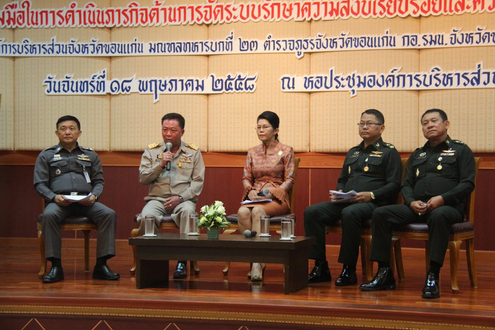 เมื่อวันที่ ๑๘ พฤษภาคม ๒๕๕๘ นายก อบจ.ขอนแก่น ดร.พงษ์ศักดิ์ ตั้งวานิชกพงษ์ เป็นผู้กล่าวรายงานโครงการบูรณาการการรักษาความสงบเรียบร้อยและความมั่นคงภายในจังหวัดขอนแก่น โดย ผู้บัญชาการตำรวจภูธรภาค ๔ พล.ต.ท.บุญเลิศ ใจประดิษฐ เป็นประธาน มีวัตถุประสงค์เพื่อให้กลไกการดำเนินภารกิจด้านการรักษาความสงบเรียบร้อยและความมั่นคงภายในจังหวัดมีประสิทธิภาพมากยิ่งขึ้นและเกิดผลในการปฏิบัติที่ชัดเจน ตลอดจนสามารถกำหนดรูปแบบและแนวทางการดำเนินงานได้อย่างเป็นรูปธรรมและส่งเสริมสนับสนุนความร่วมมือในการจัดทำโครงการ หรือกิจกรรมเกี่ยวกับการรักษาความสงบเรียบร้อยให้สอดคล้องกับอำนาจหน้าที่ที่กฎหมายกำหนด รวมทั้ง แลกเปลี่ยนความรู้ ข้อมูล ข่าวสาร ความคิดเห็นระหว่างหน่วยงาน อันจะเป็นประโยชน์ต่อการบริหารจัดการของหน่วยงานต่อไป