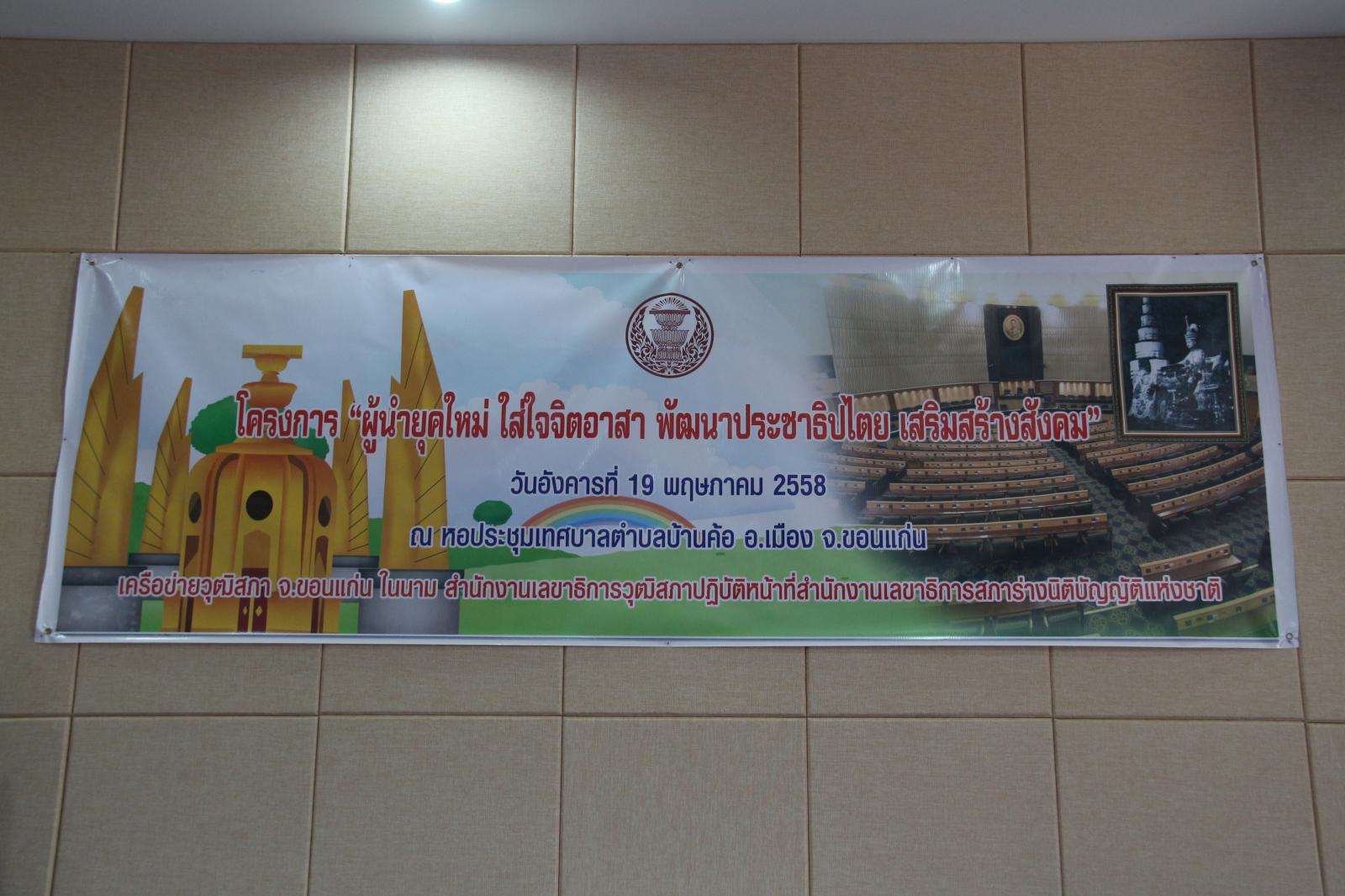เมื่อวันที่ ๑๙ พฤษภาคม ๒๕๕๘ นายก อบจ.ขอนแก่น ดร.พงษ์ศักดิ์ ตั้งวานิชกพงษ์ มอบหมายให้ รองนายก อบจ.ขอนแก่น นายสิทธิกุล ภูคำวงศ์ เป็นประธานเปิดโครงการ “ผู้นำยุคใหม่ ใส่ใจจิตอาสา พัฒนาประชาธิปไตย เสริมสร้างสังคม” มีวัตถุประสงค์เพื่อเผยแพร่ความรู้สู่สังคมประชาสัมพันธ์ บทบาทอำนาจหน้าที่สำคัญของสำนักงานเลขาวุฒิสภา และอำนาจหน้าที่ในการบริหารประเทศของสำนักงานสภาร่างนิติบัญญัติแห่งชาติ โดย นายกเทศมนตรีเทศบาลตำบลบ้านค้อ ว่าที่ร้อยตรี สมพร เทพวงษา เป็นผู้กล่าวต้อนรับ ณ ห้องประชุมเทศบาลตำบลบ้านค้อ อ.เมืองขอนแก่น จ.ขอนแก่น