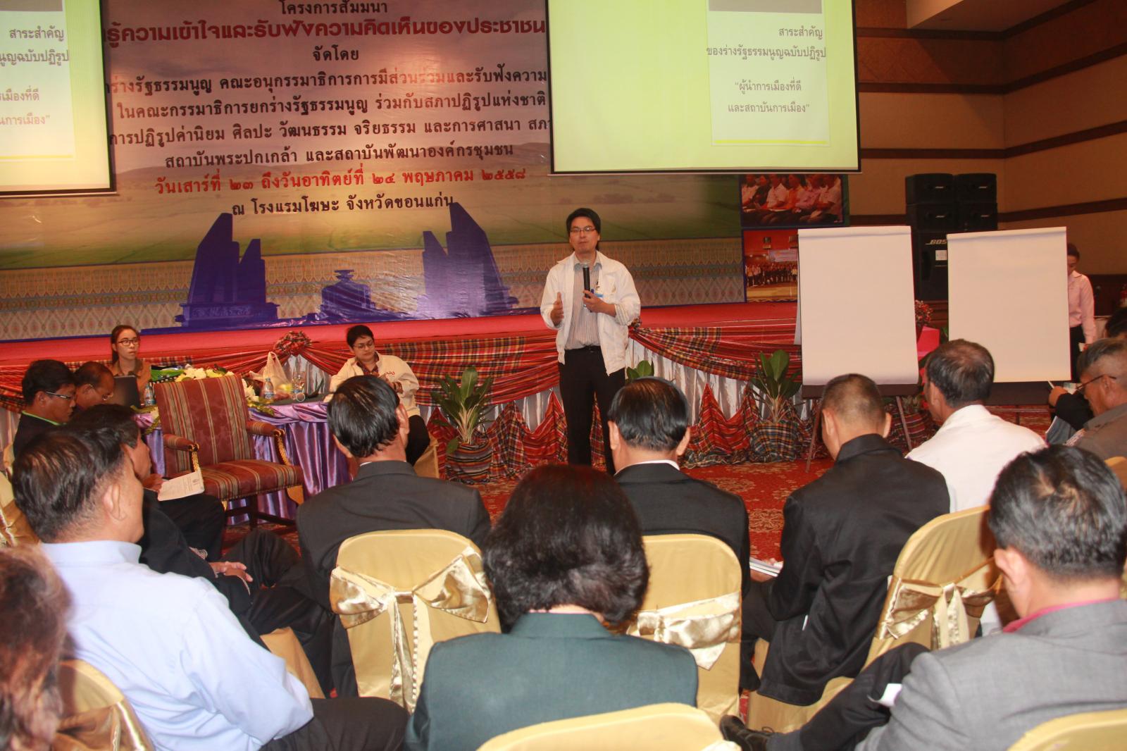 เมื่อวันที่ ๒๓ พฤษภาคม ๒๕๕๘ นายก อบจ.ขอนแก่น ดร.พงษ์ศักดิ์ ตั้งวานิชกพงษ์ มอบหมายให้ รองปลัด อบจ.ขอนแก่น นายธาดา พรหมสาขา ณ สกลนคร พร้อมด้วย ข้าราชการ พนักงาน อบจ.ขอนแก่น ร่วมโครงการสัมมนา เรื่อง “การเผยแพร่ความรู้ความเข้าใจและรับฟังความคิดเห็นของประชาชนต่อร่างรัฐธรรมนูญ” มีวัตถุประสงค์เพื่อเผยแพร่สาระสำคัญของร่างรัฐธรรมนูญและรับฟังความคิดเห็นของประชาชนต่อร่างรัฐธรรมนูญที่คณะกรรมาธิการยกร่างแล้วเสร็จเป็นร่างแรกตามบทบัญญัติมาตรา ๓๖ วรรคหนึ่ง ของรัฐธรรมนูญแห่งราชอาณาจักรไทย (ฉบับชั่วคราว) พุทธศักราช ๒๕๕๗ อีกทั้งเพื่อเป็นการนำข้อคิดเห็นที่เป็นประโยชน์ของประชาชนไปสู่การปรับปรุงแก้ไขในประเด็นต่างๆ อันจะทำให้รัฐธรรมนูญฉบับนี้เกิดความสอดคล้องกับความต้องการและเป็นรัฐธรรมนูญที่ประชาชนพึงปรารถนาอย่างแท้จริง จัดโครงการขึ้นในระหว่างวันที่ ๒๓ – ๒๔ พฤษภาคม ๒๕๕๘ ณ โรงแรมโฆษะ จังหวัดขอนแก่น อ.เมืองขอนแก่น จ.ขอนแก่น