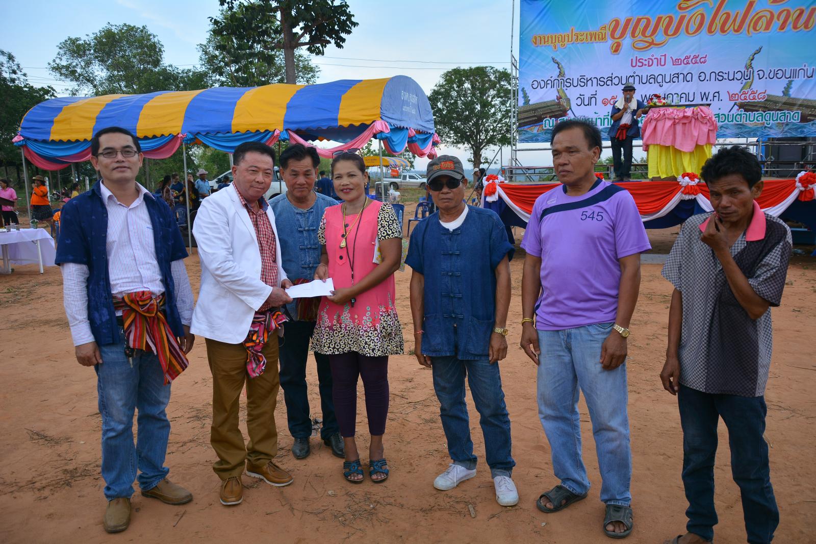 วันที่ 15 พฤษภาคม 2558 เวลา 16.30 น.ที่บริเวณสนามกีฬาหน้าที่ทำการองค์การบริหารส่วนตำบลดูนสาด อำเภอกระนวน จังหวัดขอนแก่น ดร.พงษ์ศักดิ์ ตั้งวานิชกพงษ์ นายกองค์การบริหารส่วนจังหวัดขอนแก่น เป็นประธานเปิดงานบุญประเพณี บุญบั้งไฟล้าน ประจำปี 2558 นางกรรณิการ์ สืบสารคาม สมาชิกสภา อบจ.ขอนแก่น เขต อ.กระนวน และพี่น้องประชาชนชาวอำเภอกระนวน ให้การต้อนรับ ซึ่งการจัดงานครั้งนี้มีวัตถุประสงค์เพื่อ ส่งเสริม อนุรักษ์ สืบสานประเพณี วัฒนธรรม ภูมิปัญญาท้องถิ่น ส่งเสริมการมีส่วนร่วมของประชาชนและประชาสัมพันธ์ส่งเสริมการท่องเที่ยวเชิงอนุรักษ์ประเพณี วัฒนธรรม โดยกิจกรรมในงานประกอบด้วย การประกวดเอ้บั้งไฟสวยงาม การแสดงศิลปะพื้นบ้านของตำบลดูนสาด ซึ่งการจัดงานประเพณีบุญบั้งไฟตำบลดูนสาด ในปีนี้มีขบวนแห่จากชุมชนต่างๆเข้าร่วมงานคับคั่ง มีริ้วขบวนที่สวยงาม การประดับประดาตกแต่งบั้งไฟที่งดงามตระการตา แต่ละขบวนต่างออกลีลาเพื่อสร้างสีสันกันอย่างสนุกสนาน