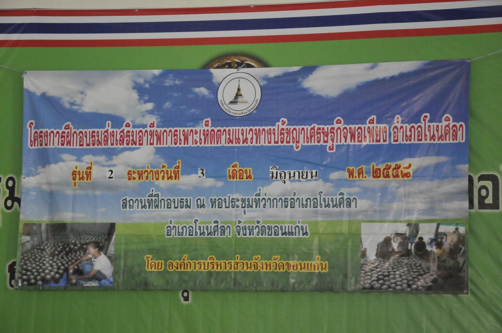 เมื่อวันที่ 3 มิถุนายน 2558 ณ หอประชุมอำเภอโนนศิลา จังหวัดขอนแก่น ดร.พงษ์ศักดิ์ ตั้งวานิชกพงษ์ นายกองค์การบริหารส่วนจังหวัดขอนแก่น เป็นประธานเปิดโครงการฝึกอบรมส่งเสริมอาชีพการเพาะเห็ดตามแนวทางปรัชญาเศรษฐกิจพอเพียง อำเภอโนนศิลา โดย กองแผนและงบประมาณ องค์การบริหารส่วนจังหวัดขอนแก่น ได้ดำเนินการจัดขึ้น เพื่อให้ความรู้แก่กลุ่มเป้าหมายเกษตรกรในเขตอำเภอโนนศิลา จังหวัดขอนแก่น เกี่ยวกับพัฒนาศักยภาพการเพาะเห็ด เพื่อเป็นการใช้เวลาว่างให้เกิดประโยชน์ ลดค่าใช้จ่ายภายในครอบครัว และเป็นการสร้างกิจกรรมการส่งเสริมอาชีพภายในครัวเรือนและชุมชน สามารถใช้เวลาว่างให้เกิดประโยชน์ โดยมี นายศรัญ กสิกิจวรกุล ส.อบจ.ขอนแก่น เขต อ.โนนศิลา กล่าวรายงาน และ นายองอาจ ฉัตรชัยพลรัตน์ ส.อบจ.ขอนแก่น อ.บ้านไผ่ เขต 2 ร่วมในพิธี