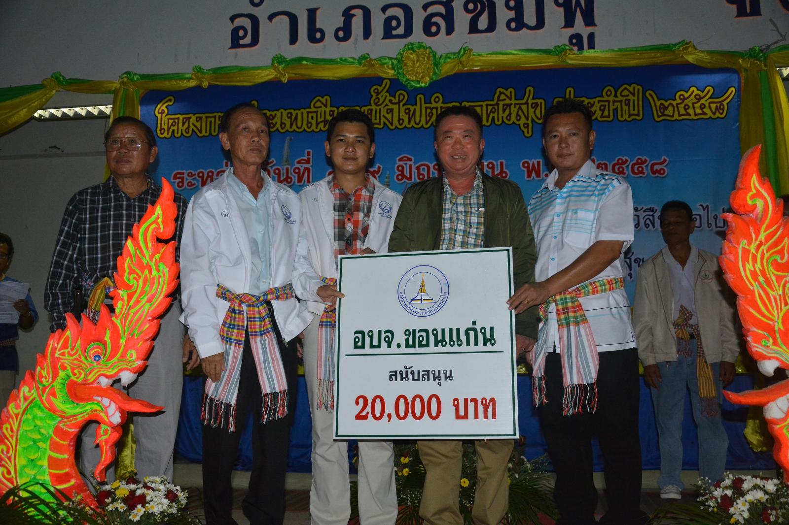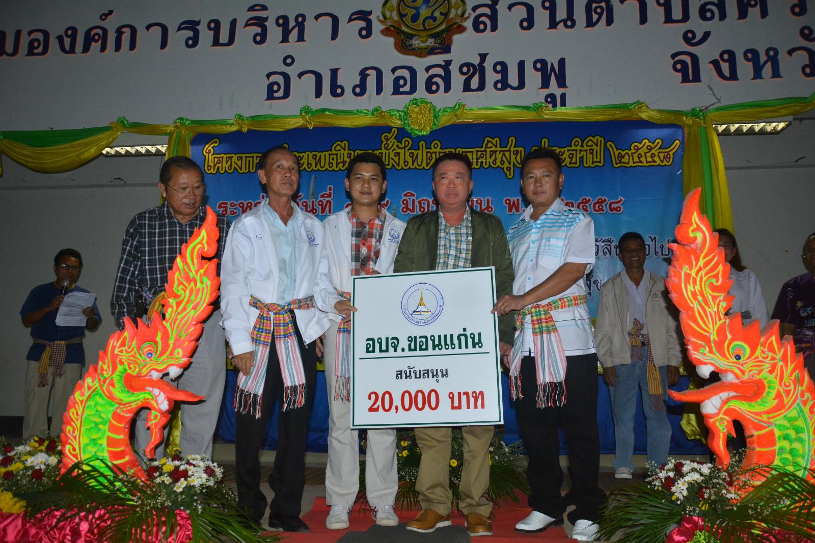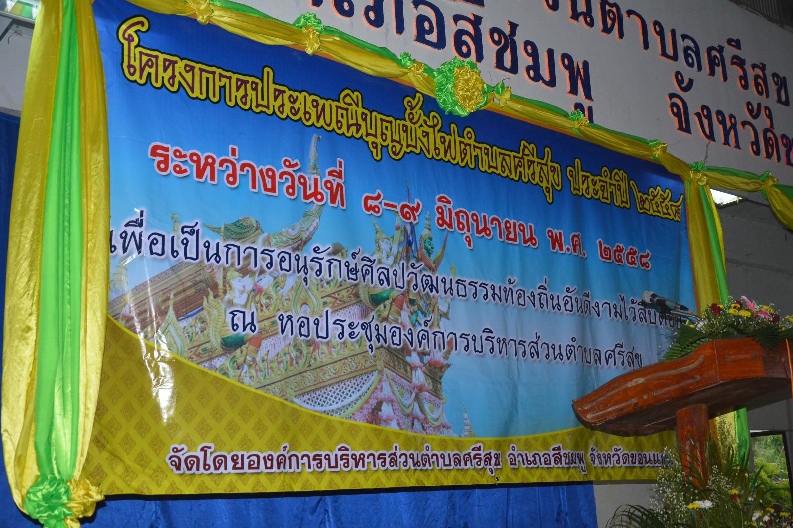 ดร.พงษ์ศักดิ์ ตั้งวานิชกพงษ์ นายกองค์การบริหารส่วนจังหวัดขอนแก่น เป็นประธานเปิดโครงการประเพณีบุญบั้งไฟตำบลศรีสุข ประจำปี 2558 ณ หอประชุมองค์การบริหารส่วนตำบลศรีสุข อำเภอสีชมพู จังหวัดขอนแก่น พร้อมมอบเงินสนับสนุนในการดำเนินงาน จำนวน 20,000.- บาท โดยมี นายวิชัย นนท์ธนากร นายกองค์การบริหารส่วนตำบลศรีสุข เป็นผู้รับมอบ นายจารุพรรณ ภูวสันติ และ นายอาทิตย์ ถนอมทุน สมาชิกสภาองค์การบริหารส่วนจังหวัดขอนแก่น เขต อำเภอสีชมพู ร่วมเป็นสักขีพยาน เมื่อวันที่ 8 มิถุนายน 2558