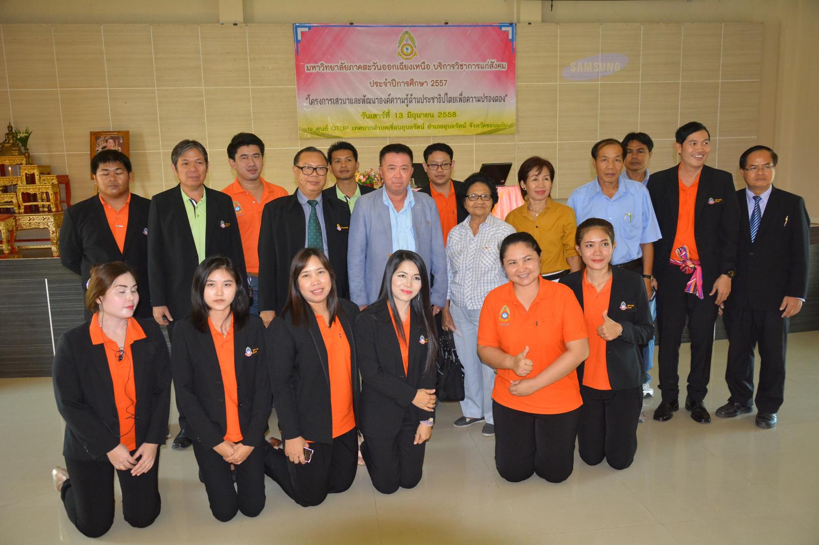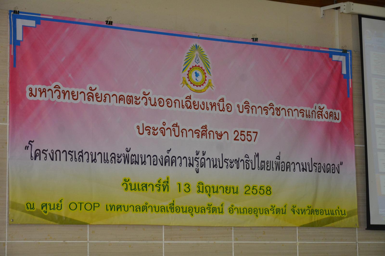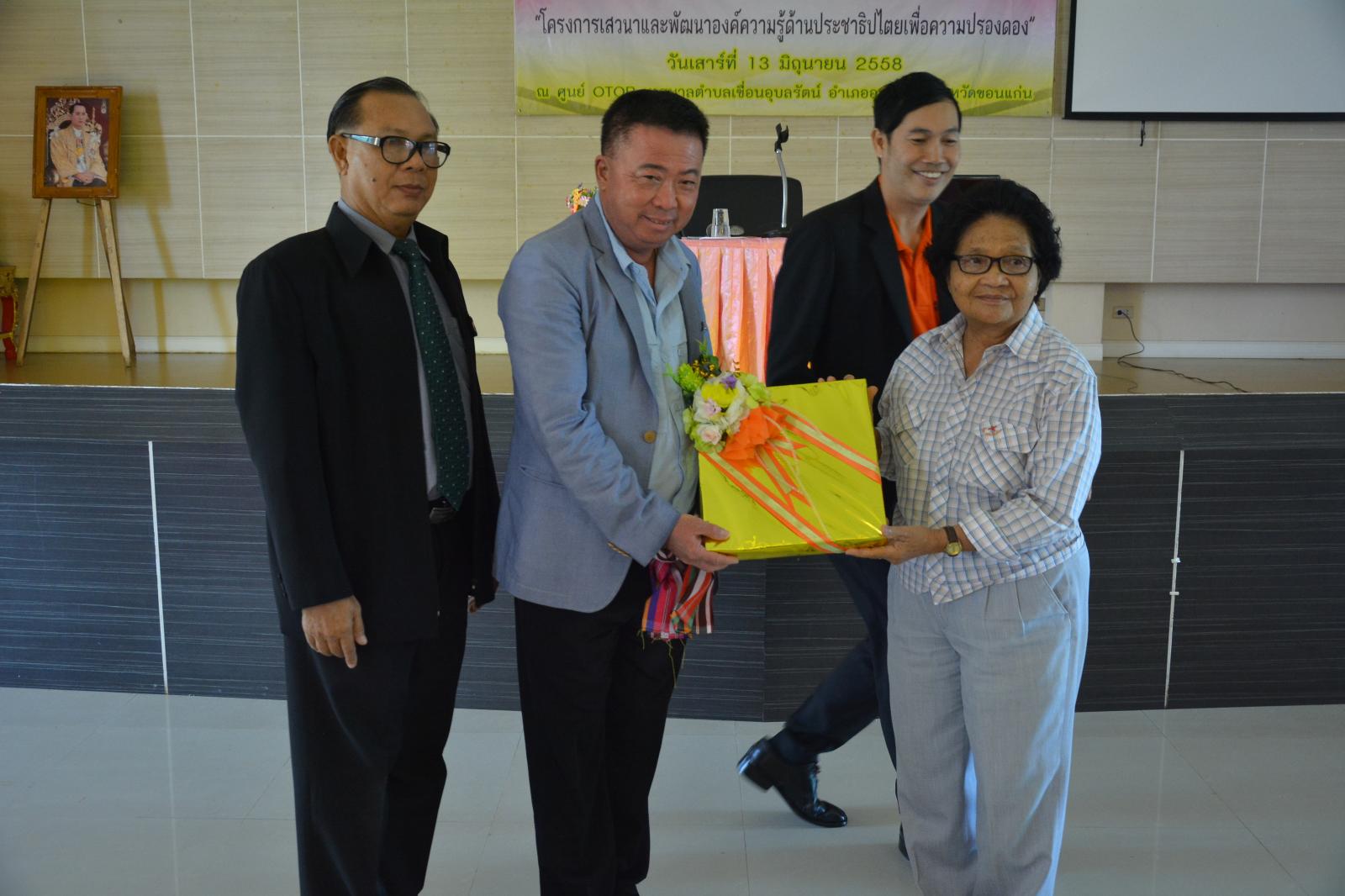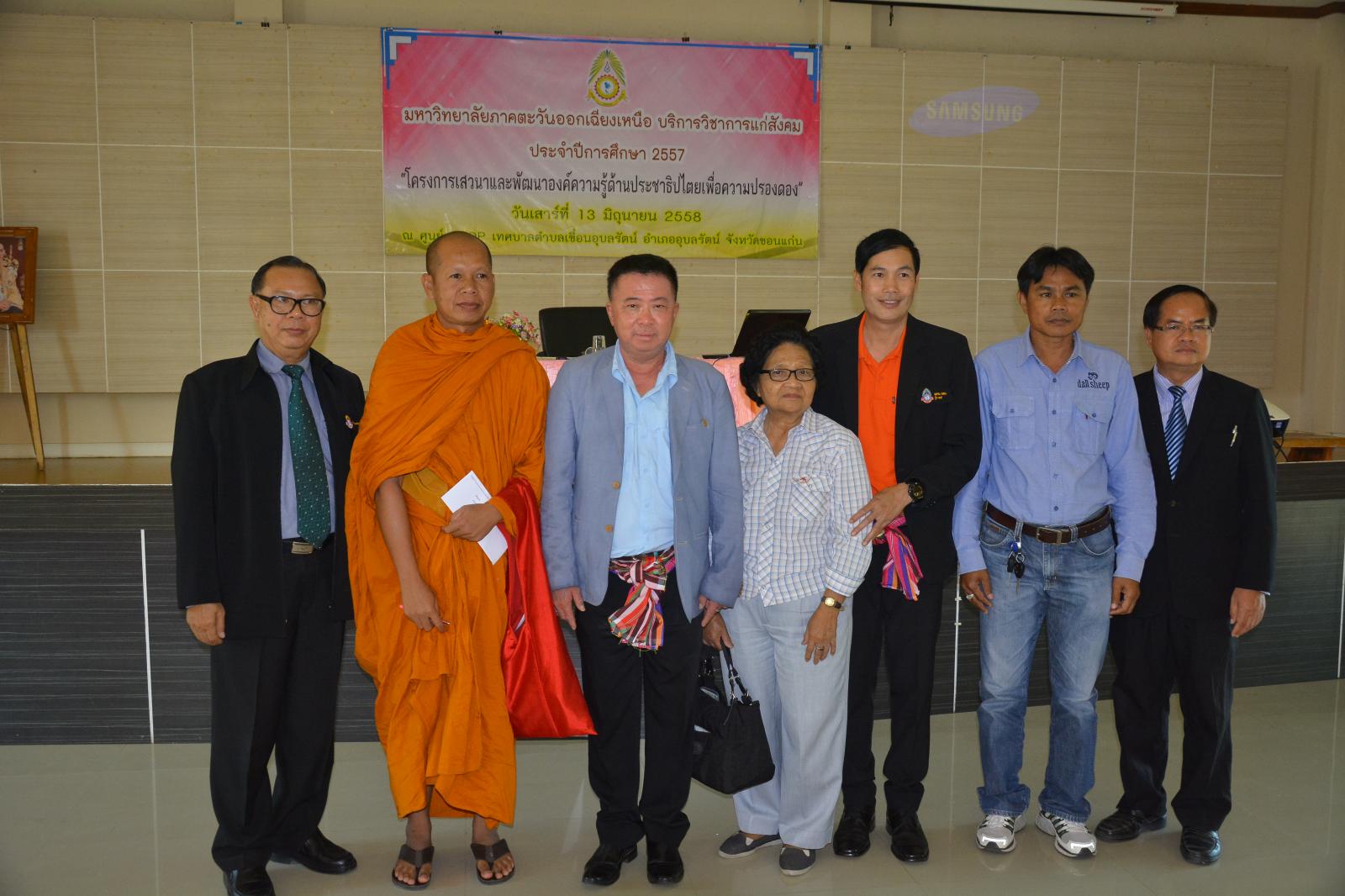 ดร.พงษ์ศักดิ์ ตั้งวานิชกพงษ์ นายกองค์การบริหารส่วนจังหวัดขอนแก่น เป็นประธานเปิด พร้อมให้เกียรติบรรยายพิเศษ ในโครงการเสวนาและพัฒนาองค์ความรู้ด้านประชาธิปไตยเพื่อความปรองดอง เมื่อวันที่ 13 มิถุนายน 2558 ณ ศูนย์ OTOP เทศบาลตำบลเขื่อนอุบลรัตน์ อำเภออุบลรัตน์ จังหวัดขอนแก่น โดยมี ด.ต.สุเมชิน รัตนไตรพันธ์ ส.อบจ.ขอนแก่น เขต อ.อุบลรัตน์ ร่วมพบปะผู้เข้าร่วมโครงการ