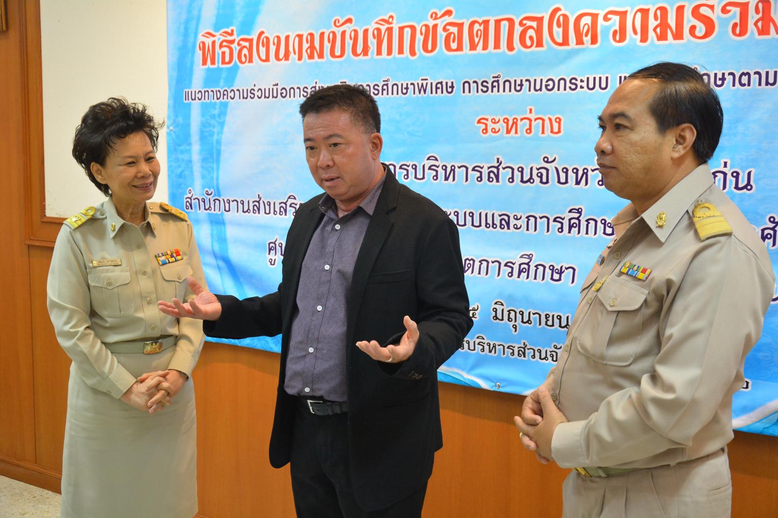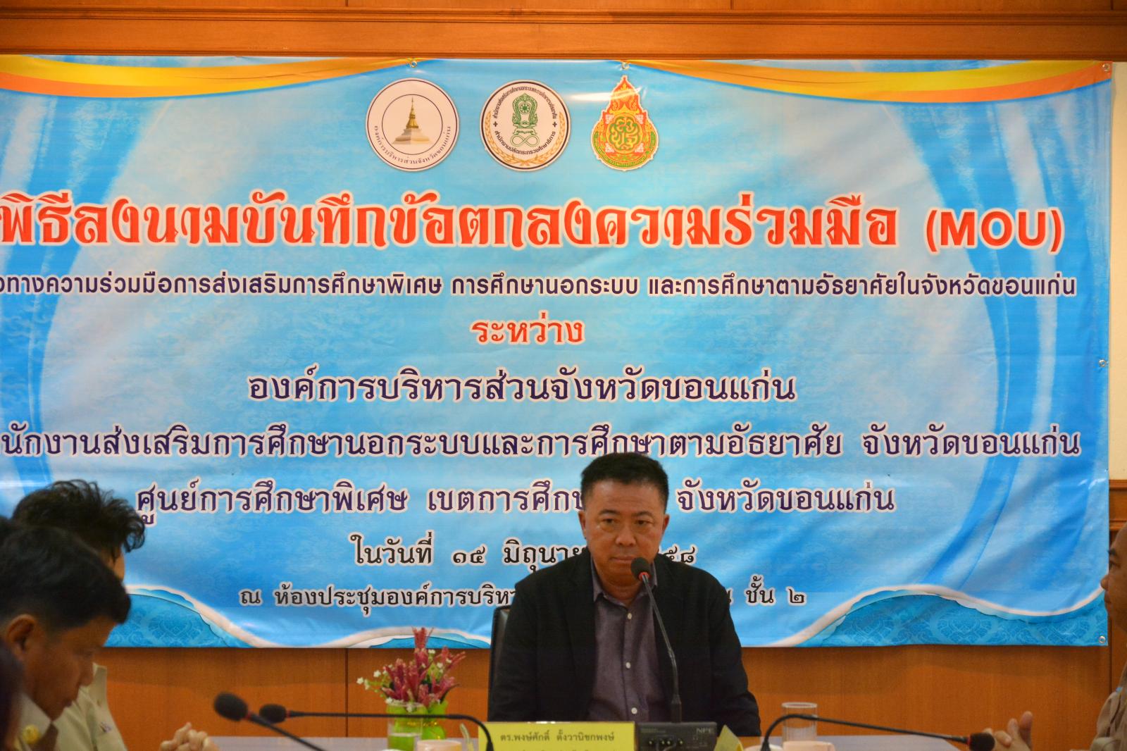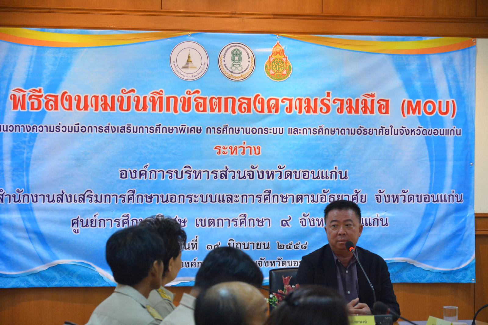 องค์การบริหารส่วนจังหวัดขอนแก่น โดยการนำของ ดร.พงษ์ศักดิ์ ตั้งวานิชกพงษ์ นายกองค์การบริหารส่วนจังหวัดขอนแก่น ได้จัดพิธีลงนามบันทึกข้อตกลงแนวทางความร่วมมือการส่งเสริมการศึกษาพิเศษ การศึกษานอกระบบ และการศึกษาตามอัธยาศัยในจังหวัดขอนแก่น ในวันจันทร์ที่ 15 มิถุนายน 2558 เวลา 10.00 น. ณ ห้องประชุมองค์การบริหารส่วนจังหวัดขอนแก่น ชั้น 2 โดย องค์การบริหารส่วนจังหวัดขอนแก่น สำนักงานส่งเสริมการศึกษานอกระบบและการศึกษาตามอัธยาศัย จังหวัดขอนแก่น ร่วมกับ ศูนย์การศึกษาพิเศษ เขตการศึกษา 9 จังหวัดขอนแก่น