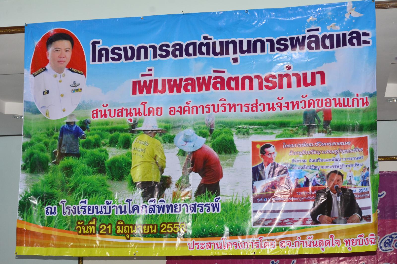วันที่ 21 มิถุนายน 2558 ดร.พงษ์ศักดิ์ ตั้งวานิชกพงษ์ นายกองค์การบริหารส่วนจังหวัดขอนแก่น เป็นประธานในพิธีเปิดโครงการลดต้นทุนการผลิตและเพิ่มผลผลิตการทำนา ณ โรงเรียนบ้านโคกสีพิทยาสรรพ์ อำเภอเมือง จังหวัดขอนแก่น เพื่อเป็นแนวทางสำหรับเกษตรกรผู้เข้าร่วมโครงการด้านการลดต้นทุน เพิ่มผลผลิต เพิ่มคุณภาพข้าว โดยมี นายสุดใจ ทุยบึงฉิม ส.อบจ.ขอนแก่น อ.เมือง เขต 6 เป็นผู้ประสานงบประมาณในการดำเนินโครงการ