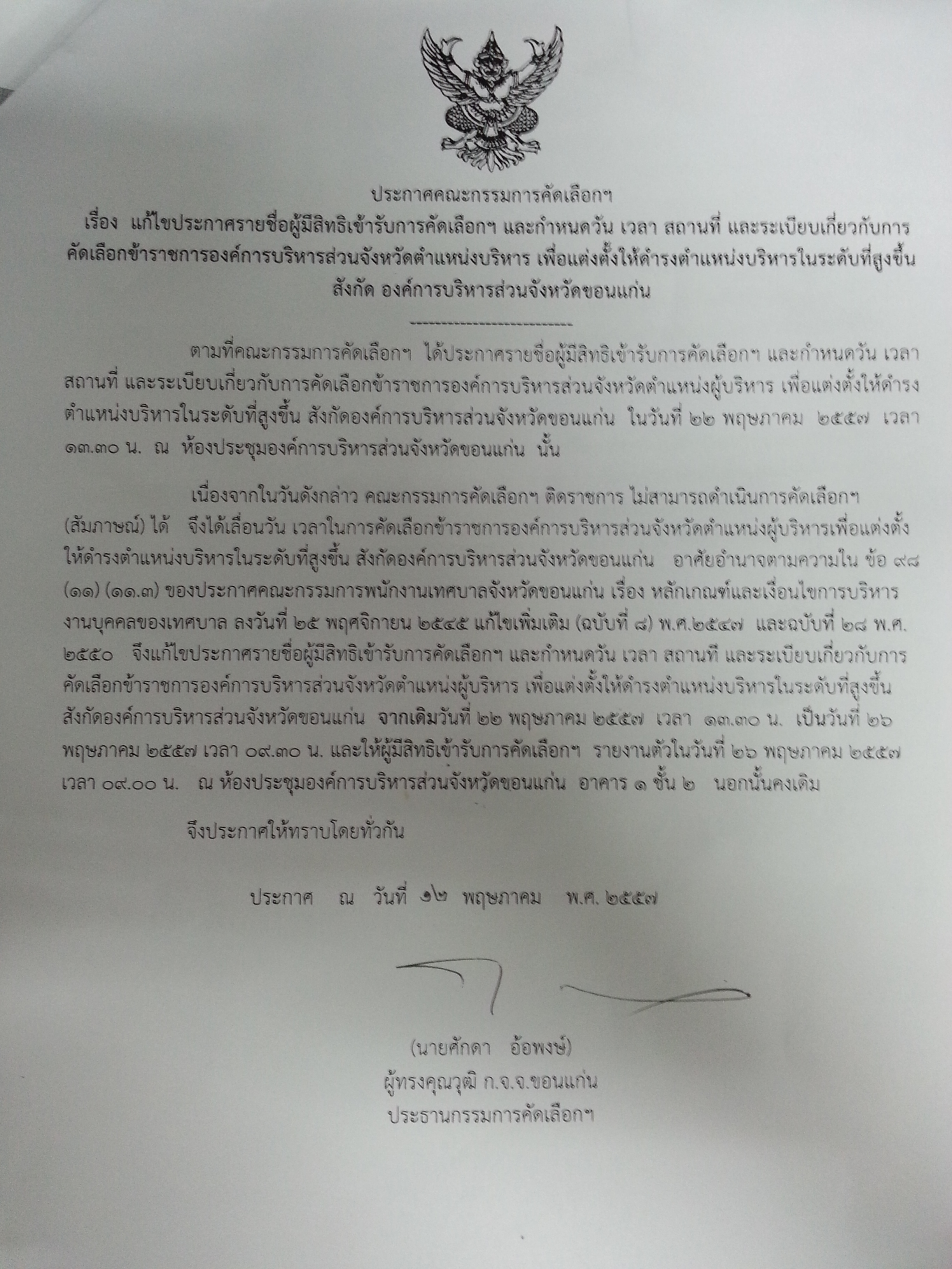 แก้ไขประกาศรายชื่อผู้มีสิทธิเข้ารับการคัดเลือกฯและกำหนดวัน เวลา สถานที่ และระเบียบเกี่ยวกับการคัดเลือกข้าราชการองค์การบริหารส่วนจังหวัดตำแหน่งบริหาร เพื่อแต่งตั้งให้ดำรงตำแหน่งบริหารในระดับที่สูงขึ้น สังกัด องค์การบริหารส่วนจังหวัดขอนแก่น