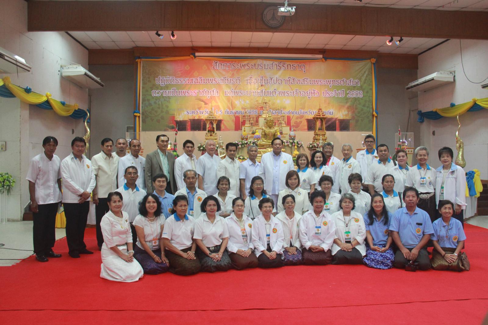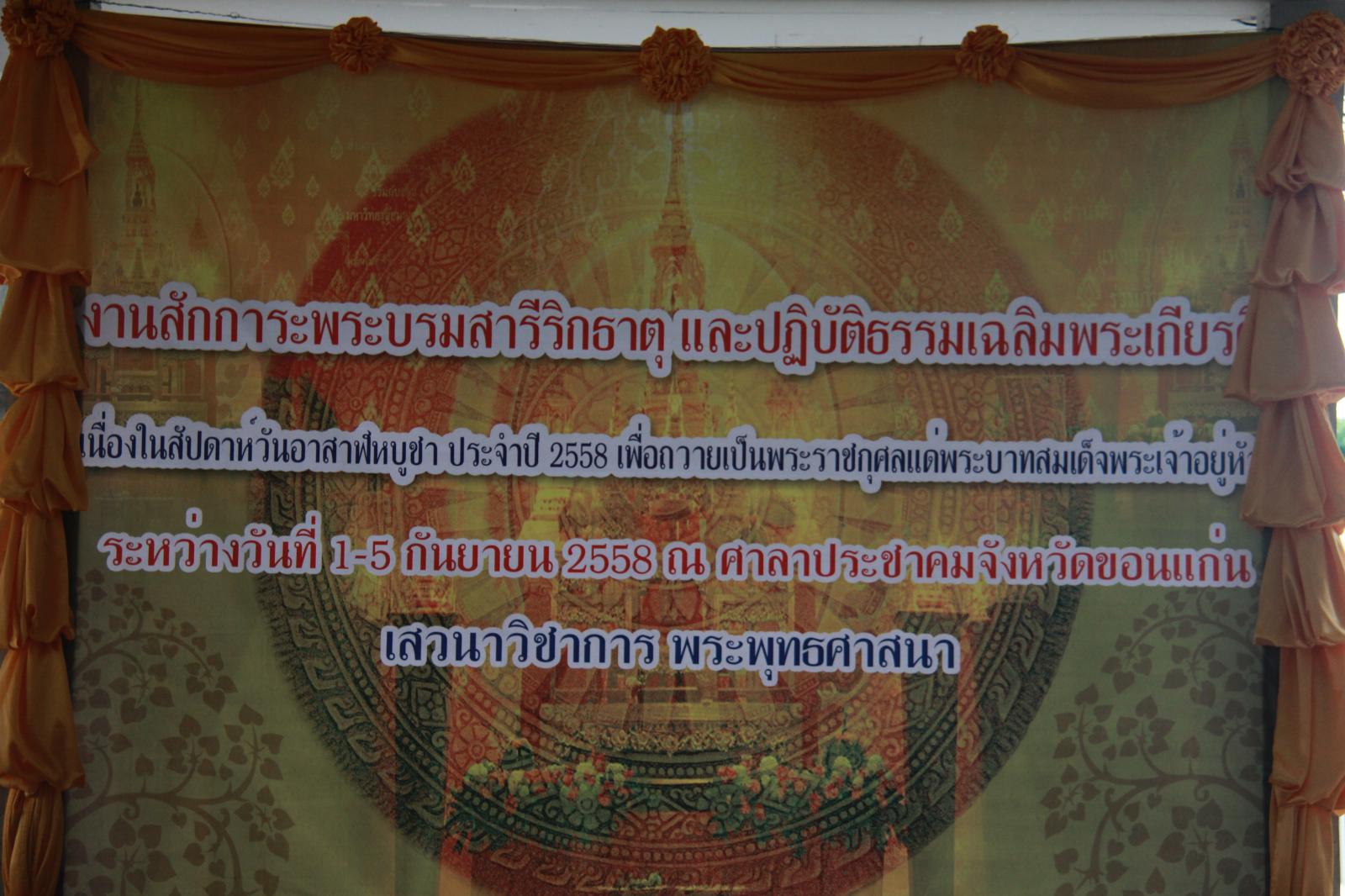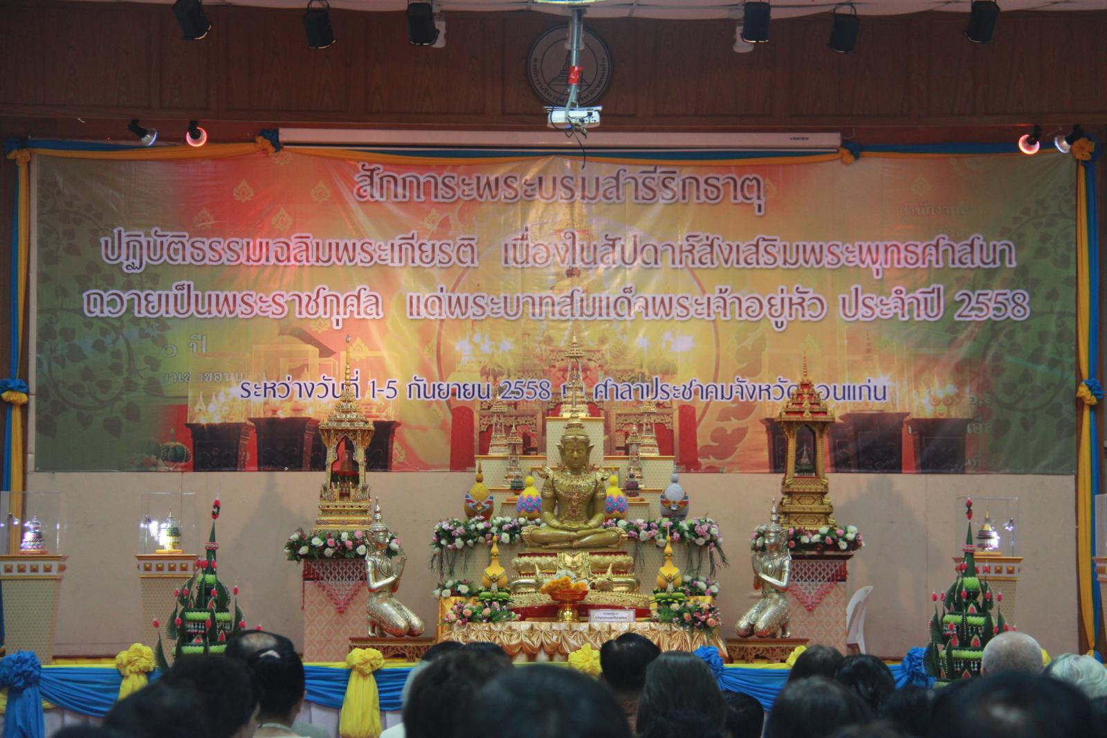 เมื่อวันที่ ๑ กันยายน ๒๕๕๘ นายก อบจ.ขอนแก่น ดร.พงษ์ศักดิ์ ตั้งวานิชกพงษ์ มอบหมายให้ รองนายก อบจ.ขอนแก่น นายสิทธิกุล ภูคำวงศ์ พร้อมด้วย ผู้อำนวยการสำนักการช่าง นายวิรัติ นาคนชมร่วมพิธีเปิดโครงการสักการะพระบรมสารีริกธาตุ ปฏิบัติธรรมเฉลิมพระเกียรติ เนื่องในสัปดาห์ ส่งเสริมพระพุทธศาสนา วันอาสาฬหบูชา ประจำปี ๒๕๕๘ เพื่อถวายเป็นพระราชกุศล แด่ พระบาทสมเด็จพระเจ้าอยู่หัวฯ เนื่องในโอกาสเฉลิมพระชนมพรรษา ๘๘ พรรษา ๕ ธันวาคม ๒๕๕๘ โดย ผู้ว่าราชการจังหวัดขอนแก่น นายกำธร ถาวรสถิตย์ ให้เกียรติเป็นประธานในพิธี โดยมี ผู้อำนวยสำนักงานพระพุทธศาสนาจังหวัดขอนแก่น นายสิทธิกร อ้วนศิริ เป็นผู้กล่าวรายงาน ในโอกาสนี้ มี รองผู้บังคับการตำรวจภูธรจังหวัดขอนแก่น พ.ต.อ.สุภากร คำสิงห์นอก ร่วมเป็นเกียรติในพิธี จัดโครงการขึ้นในระหว่างวันที่ ๑ – ๕ กันยายน ๒๕๕๘ ณ ศาลาประชาคม องค์การบริหารส่วนจังหวัดขอนแก่น อ.เมืองขอนแก่น จ.ขอนแก่น