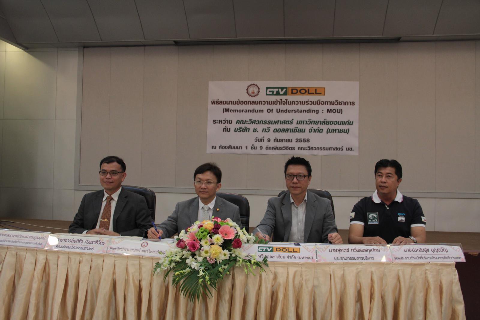 เมื่อวันที่ ๙ กันยายน ๒๕๕๘ นายก อบจ.ขอนแก่น ดร.พงษ์ศักดิ์ ตั้งวานิชกพงษ์ มอบหมายให้ รองนายก อบจ.ขอนแก่น นายสิทธิกุล ภูคำวงศ์ ร่วมพิธีลงนามบันทึกข้อตกลงความเข้าใจในความร่วมมือทางวิชาการ พร้อมฟังบรรยายพิเศษในหัวข้อ “วิศวกรไทยอย่าตายไปพร้อมกับความฝัน” และฟังเสวนา ในหัวข้อ “ระบบขนส่งมวลชนสำหรับนครขอนแก่น” โดยมี รองคณบดีฝ่ายวิจัย บัณฑิตศึกษา และอุตสาหกรรมสัมพันธ์ ผู้ช่วยศาสตราจารย์ ดร.วีรพัฒน์ เศรษฐ์สมบูรณ์ เป็นผู้กล่าวรายงาน ในโอกาสนี้มี คณบดีคณะวิศวกรรมศาสตร์ มหาวิทยาลัยขอนแก่น ศาสตราจารย์ ดร.อภิรัฐ ศิริธราธิวัตร และประธานกรรมการบริหาร บริษัท ช.ทวีดอลลาเซียน จำกัด (มหาชน) นายสุรเดช ทวีแสงสกุลไทย เป็นผู้กล่าวแสดงความยินดี และร่วมลงนาม ในครั้งนี้ ณ ห้องสัมมนา ๑ ชั้น ๙ ตึกเพียรวิจิตร คณะวิศวกรรมศาสตร์ มหาวิทยาลัยขอนแก่น อ.เมืองขอนแก่น จ.ขอนแก่น