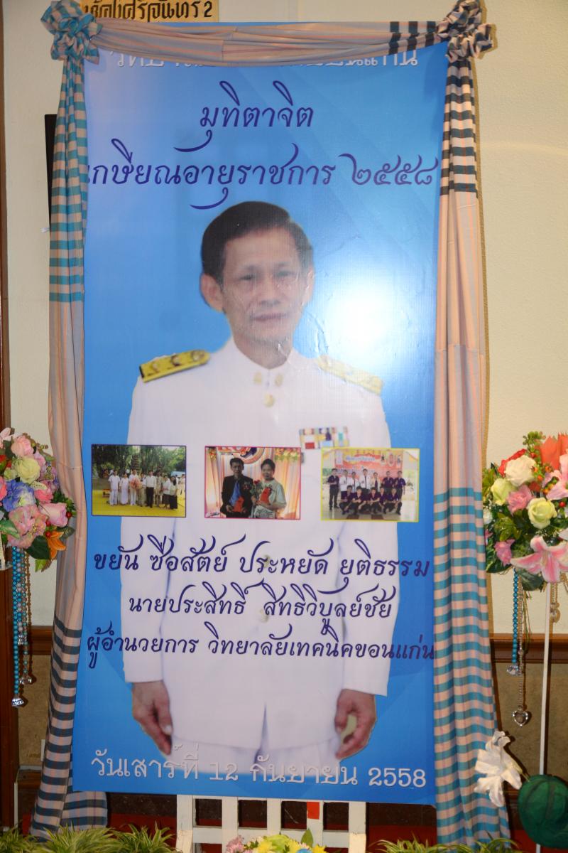 วันที่ 12 กันยายน 2558 ดร.พงษ์ศักดิ์ ตั้งวานิชกพงษ์ นายกองค์การบริหารส่วนจังหวัดขอนแก่น ร่วมงานเลี้ยงเกษียณอายุราชการ ท่านประสิทธิ์ สิทธิวิบูลย์ชัย ผู้อำนวยการวิทยาลัยเทคนิคขอนแก่น ในงานแสดงมุทิตาจิต ประจำปี 2558 “ครูคือผู้สร้าง” จากวันวาน ที่พากเพียร สู่วันเกษียณ ที่ภาคภูมิ” ระหว่างการจัดงานมีการแสดงต่างๆ สามารถเพิ่มรอยยิ้มให้แก่ผู้ร่วมงานและเป็นกำลังใจให้แก่ผู้เกษียณอายุราชการได้เป็นอย่างดี