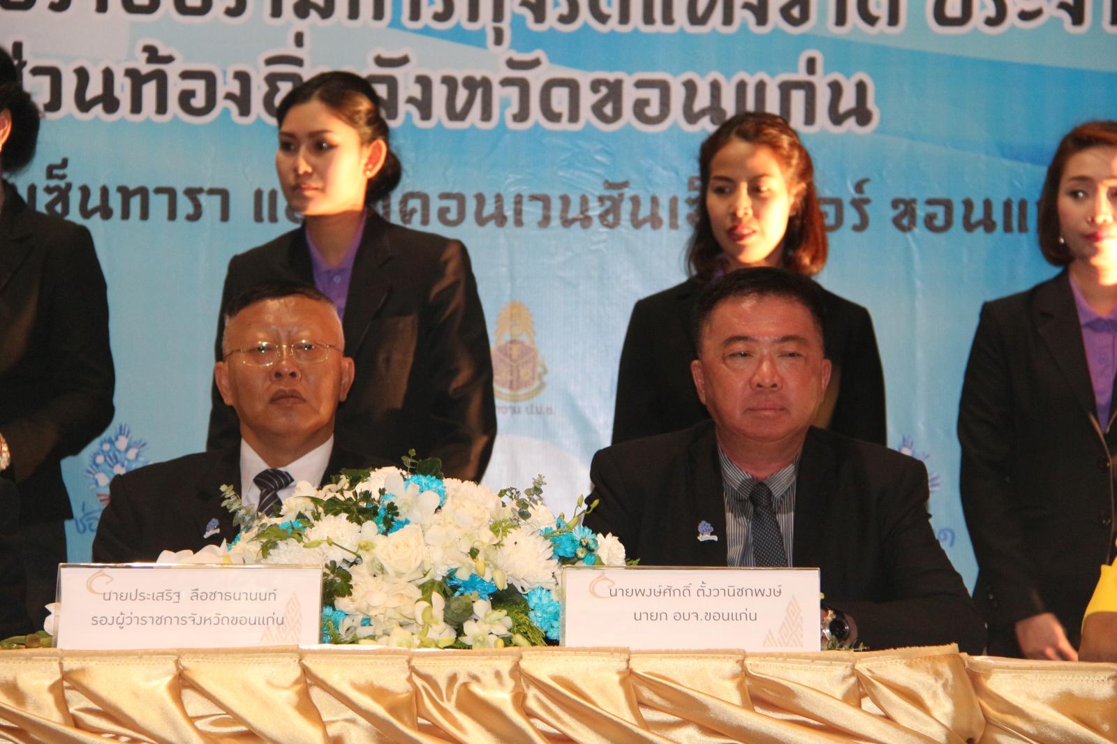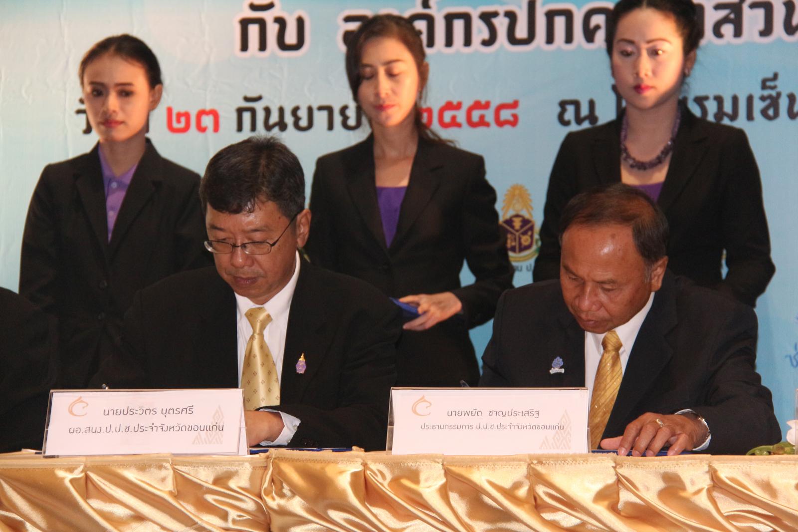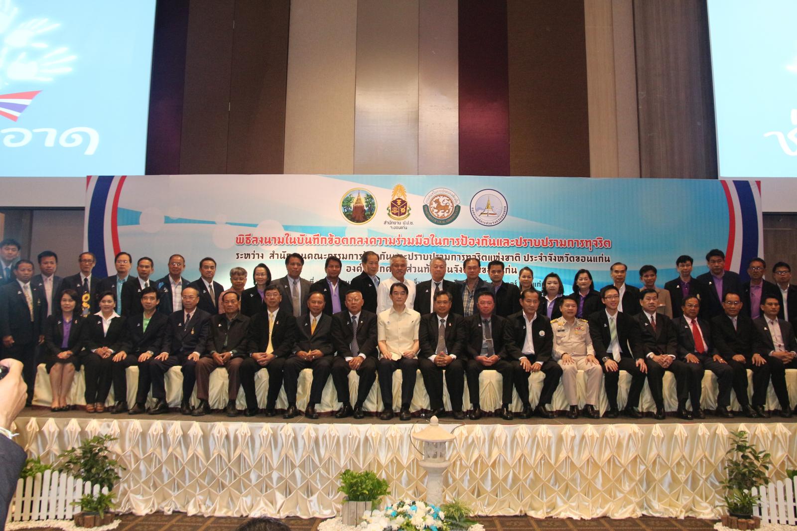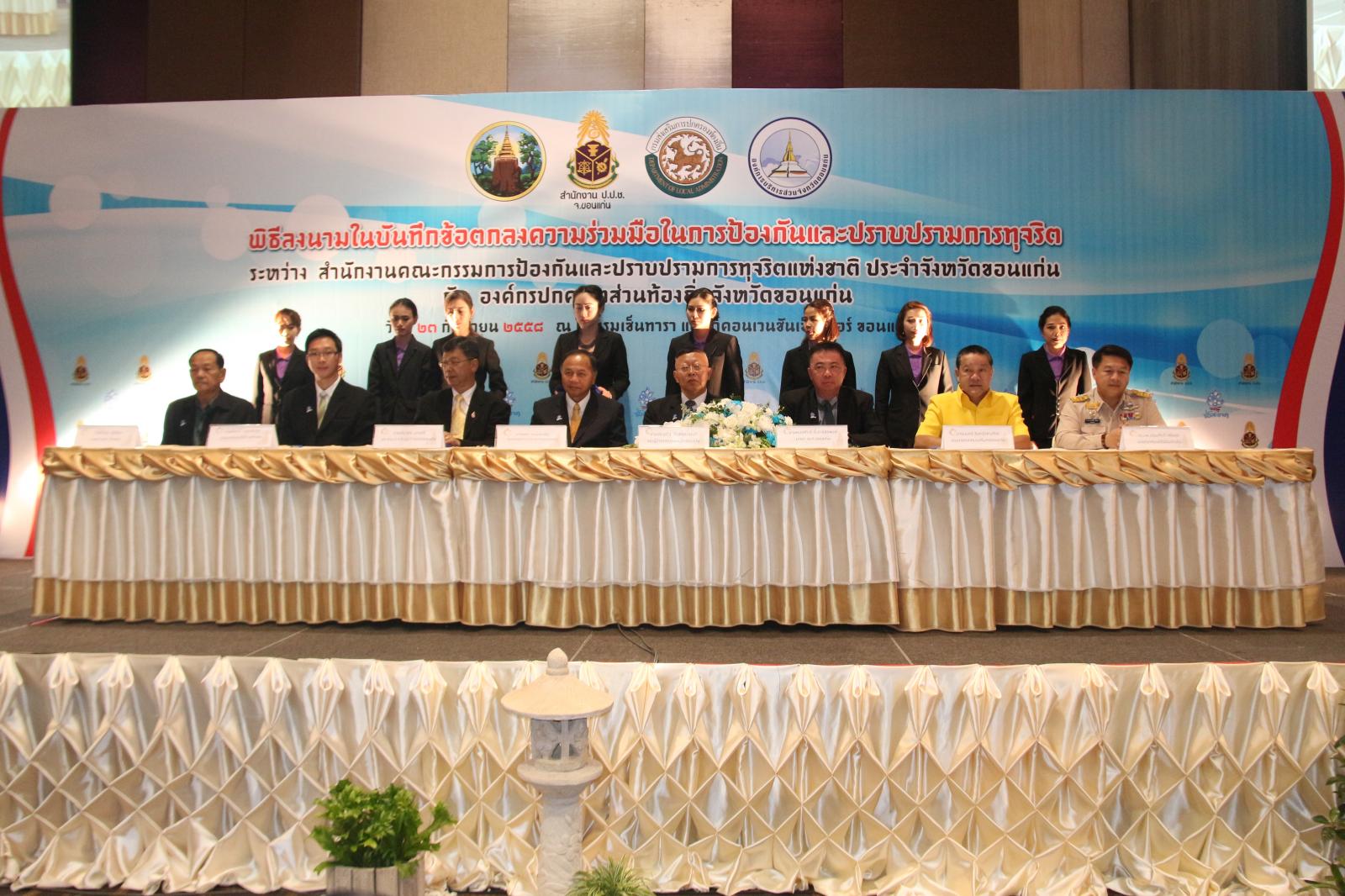 ในโอกาสนี้ องค์การบริหารส่วนจังหวัดขอนแก่น โดย นายก อบจ.ขอนแก่น ดร.พงษ์ศักดิ์ ตั้งวานิชกพงษ์ จัดให้มีพิธีลงนามบันทึกข้อตกลงความร่วมมือในการป้องกันและปราบปรามการทุจริต ระหว่าง สำนักงานคณะกรรมการป้องกันและปราบปรามการทุจริตแห่งชาติ ประจำจังหวัดขอนแก่น กับ องค์กรปกครองส่วนท้องถิ่นจังหวัดขอนแก่น โดยมี รองผู้ว่าราชการจังหวัดขอนแก่น นายประเสริฐ ลือชาธนานนท์ พร้อมด้วย ประธานกรรมการ ป.ป.ช.ขอนแก่น นายพยัต ชาญประเสริฐ ,ผู้อำนวยการสำนักงาน ป.ป.ช.ประจำจังหวัดขอนแก่น นายประวิตร บุตรศรี ,นายก อบจ.ขอนแก่น ดร.พงษ์ศักดิ์ ตั้งวานิชกพงษ์ ,นายกเทศมนตรีตำบลท่าพระ นายพิสุทธิ์ อนุตรอังกูร ,รองปลัดเทศบาลนครขอนแก่น นายกฤษณวรุณ ไชยนิจ ,นายก อบต.คำแคน นายหาญ อุปถัมภ์ และนายกเทศมนตรีเมืองบ้านไผ่ นายแพทย์เปรมศักดิ์ เพียยุระ เป็นผู้ร่วมลงนาม ทั้งนี้มีสมาชิกสภาองค์การบริหารส่วนจังหวัดขอนแก่น พร้อมด้วย คณะผู้บริหาร หัวหน้าส่วนราชการ ข้าราชการ ข้าราชการครูโรงเรียนในสังกัดองค์การบริหารส่วนจังหวัดขอนแก่น ทั้งนี้มีผู้แทนจากองค์กรปกครองส่วนท้องถิ่นทุกแห่งในเขตพื้นที่ จังหวัดขอนแก่น คณะกรรมการ ป.ป.ช.ประจำจังหวัดขอนแก่น ตลอดจนสื่อมวลชนทุกแขนง ในจังหวัดขอนแก่น ร่วมเป็นเกียรติในพิธี ณ โรงแรมเซ็นทราราคอนเวนชั่นเซ็นเตอร์ขอนแก่น