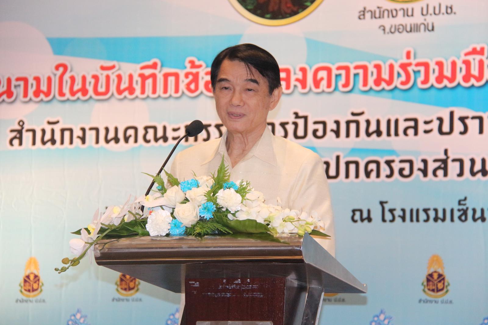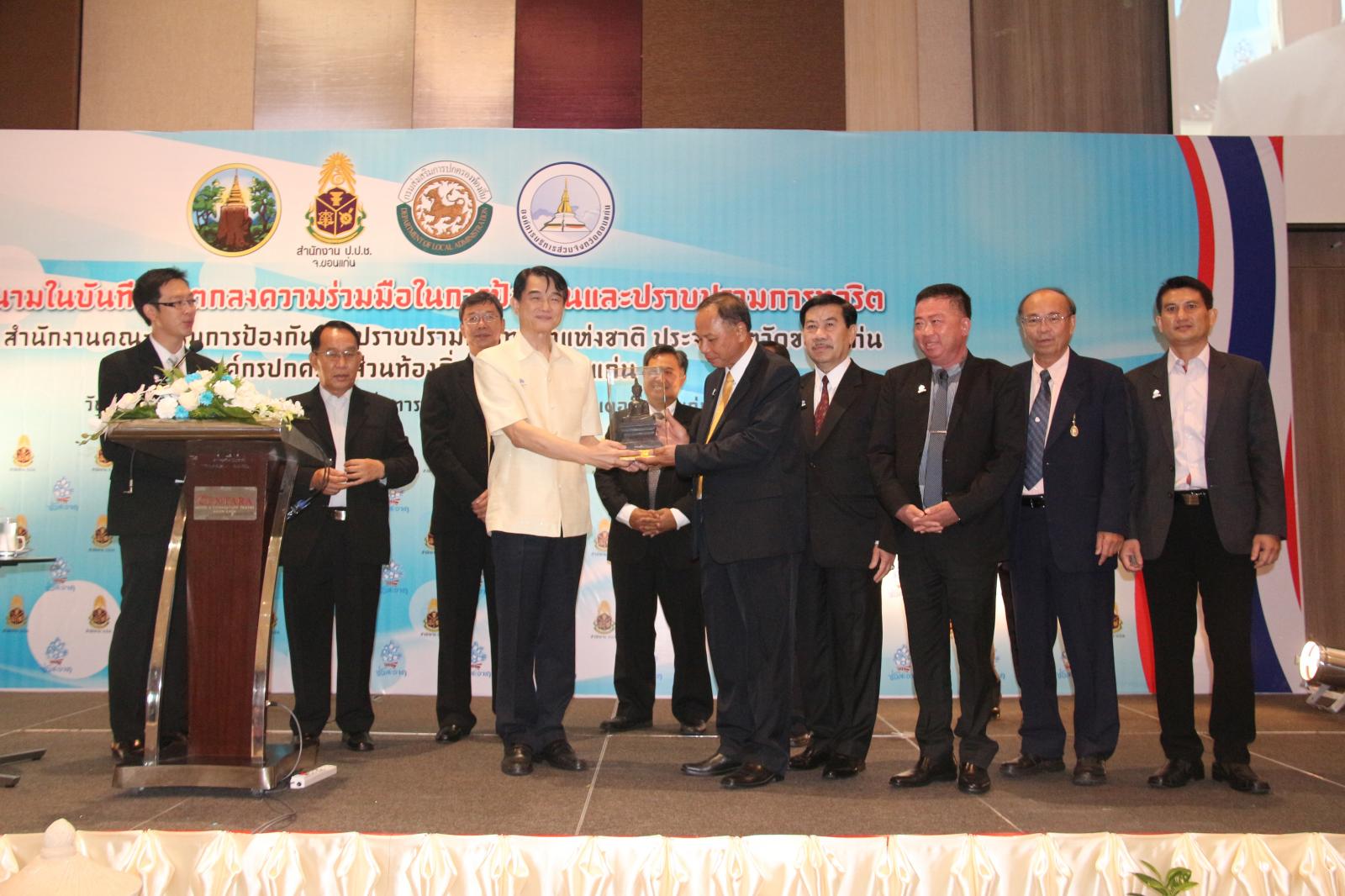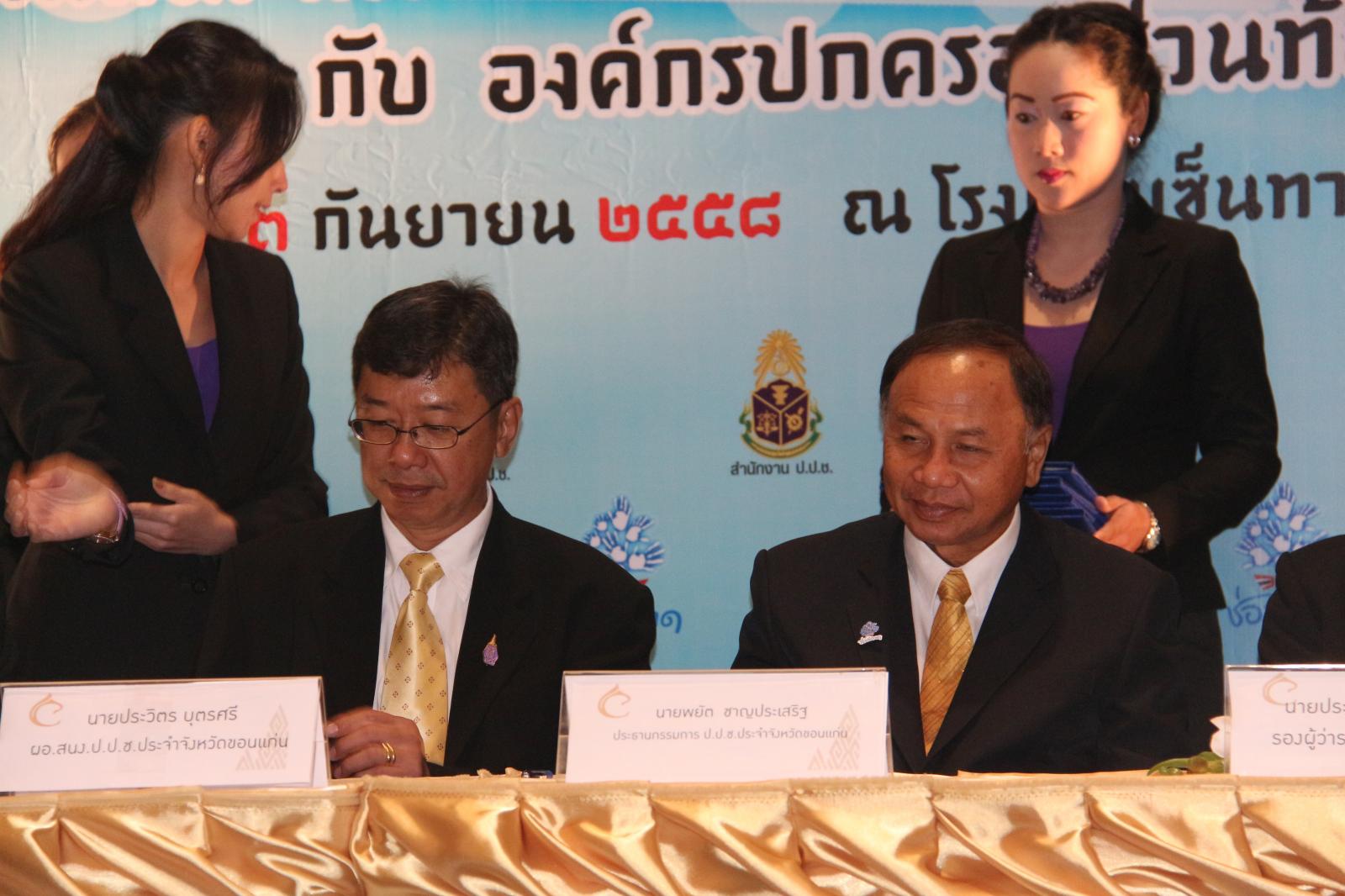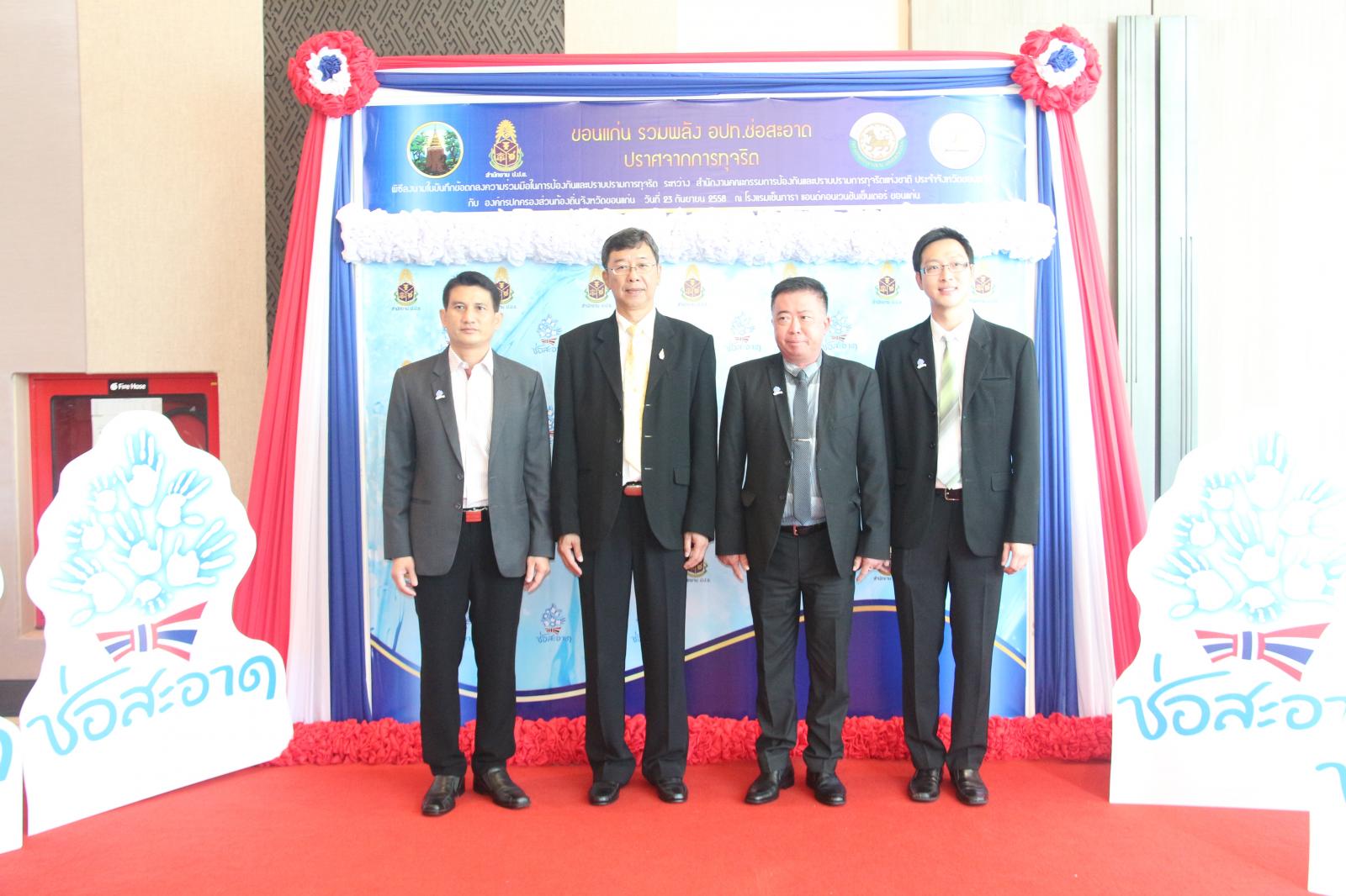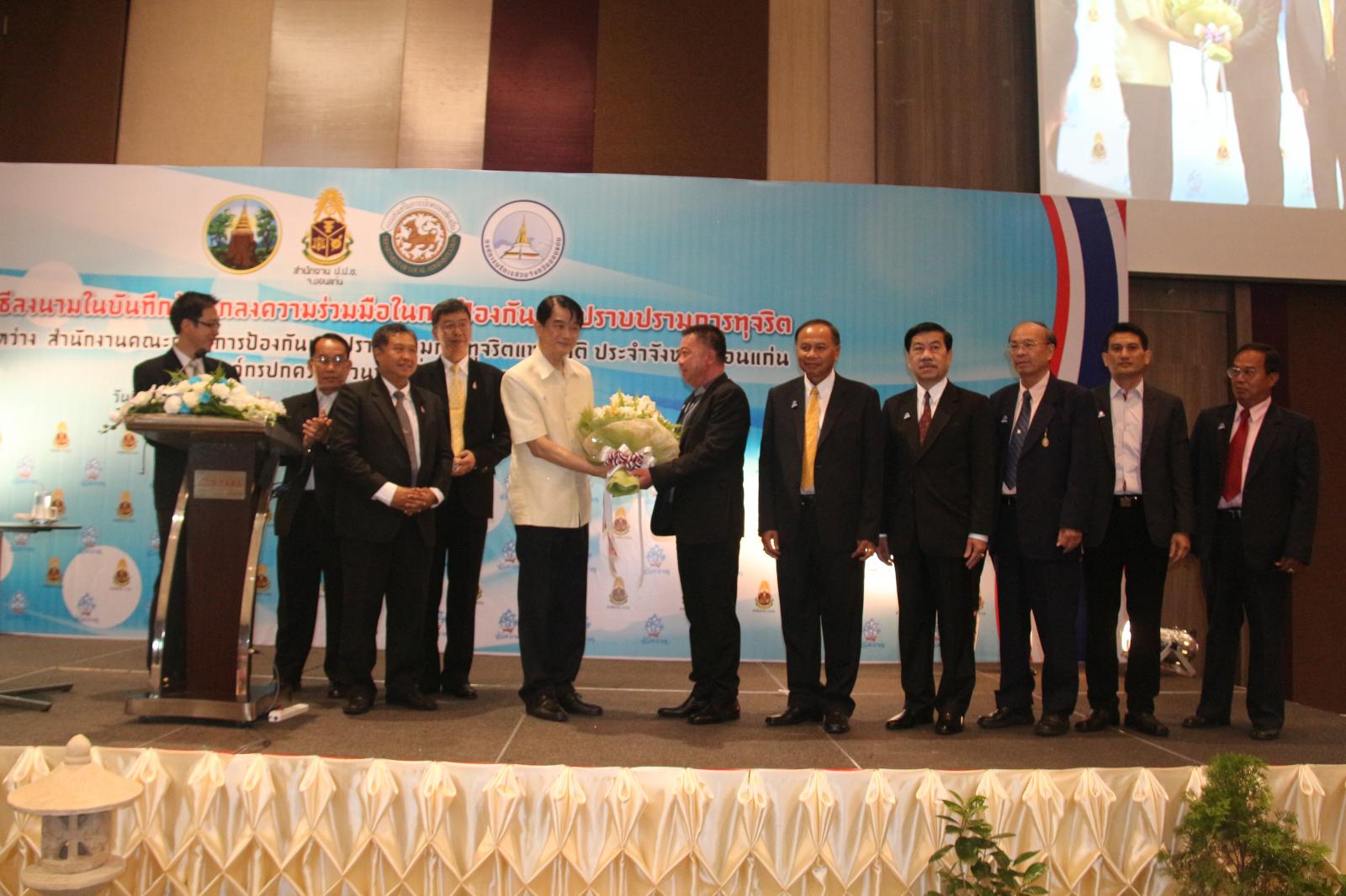 ในโอกาสนี้ องค์การบริหารส่วนจังหวัดขอนแก่น โดย นายก อบจ.ขอนแก่น ดร.พงษ์ศักดิ์ ตั้งวานิชกพงษ์ จัดให้มีพิธีลงนามบันทึกข้อตกลงความร่วมมือในการป้องกันและปราบปรามการทุจริต ระหว่าง สำนักงานคณะกรรมการป้องกันและปราบปรามการทุจริตแห่งชาติ ประจำจังหวัดขอนแก่น กับ องค์กรปกครองส่วนท้องถิ่นจังหวัดขอนแก่น โดยมี รองผู้ว่าราชการจังหวัดขอนแก่น นายประเสริฐ ลือชาธนานนท์ พร้อมด้วย ประธานกรรมการ ป.ป.ช.ขอนแก่น นายพยัต ชาญประเสริฐ ,ผู้อำนวยการสำนักงาน ป.ป.ช.ประจำจังหวัดขอนแก่น นายประวิตร บุตรศรี ,นายก อบจ.ขอนแก่น ดร.พงษ์ศักดิ์ ตั้งวานิชกพงษ์ ,นายกเทศมนตรีตำบลท่าพระ นายพิสุทธิ์ อนุตรอังกูร ,รองปลัดเทศบาลนครขอนแก่น นายกฤษณวรุณ ไชยนิจ ,นายก อบต.คำแคน นายหาญ อุปถัมภ์ และนายกเทศมนตรีเมืองบ้านไผ่ นายแพทย์เปรมศักดิ์ เพียยุระ เป็นผู้ร่วมลงนาม ทั้งนี้มีสมาชิกสภาองค์การบริหารส่วนจังหวัดขอนแก่น พร้อมด้วย คณะผู้บริหาร หัวหน้าส่วนราชการ ข้าราชการ ข้าราชการครูโรงเรียนในสังกัดองค์การบริหารส่วนจังหวัดขอนแก่น ทั้งนี้มีผู้แทนจากองค์กรปกครองส่วนท้องถิ่นทุกแห่งในเขตพื้นที่ จังหวัดขอนแก่น คณะกรรมการ ป.ป.ช.ประจำจังหวัดขอนแก่น ตลอดจนสื่อมวลชนทุกแขนง ในจังหวัดขอนแก่น ร่วมเป็นเกียรติในพิธี ณ โรงแรมเซ็นทราราคอนเวนชั่นเซ็นเตอร์ขอนแก่น