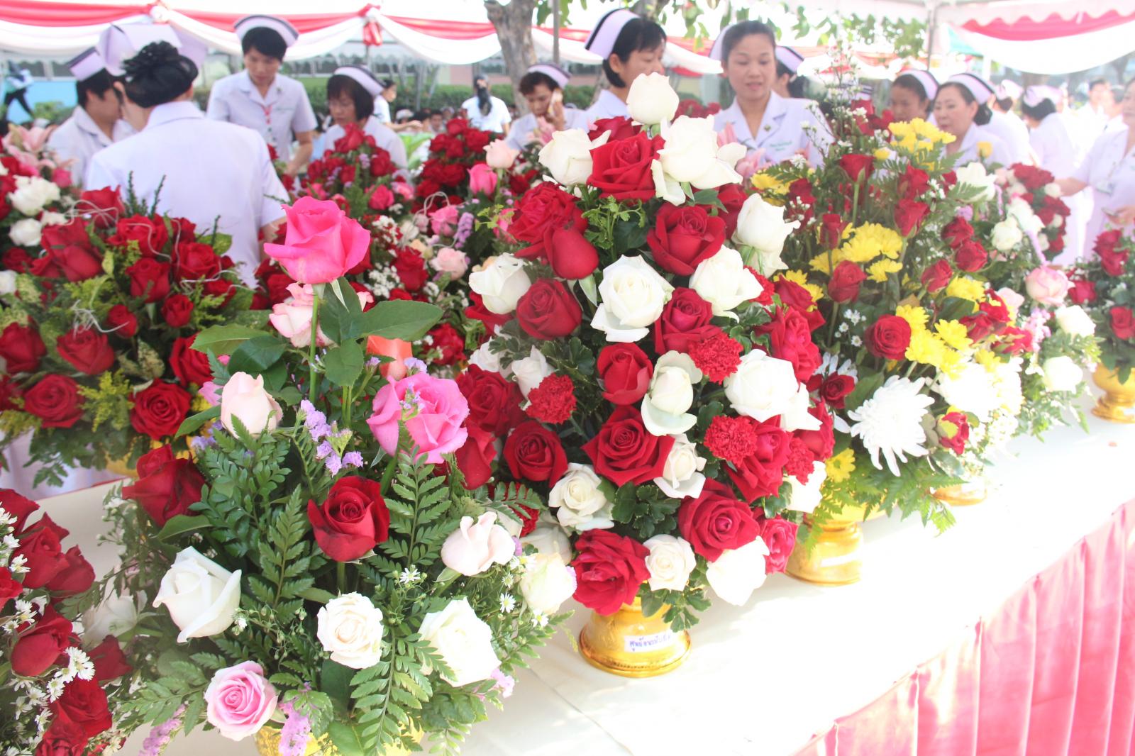 พิธีวางพานพุ่มดอกไม้สด เนื่องในพิธีถวายราชสักการะสมเด็จพระศรีนครินทราบรมราชชนนี